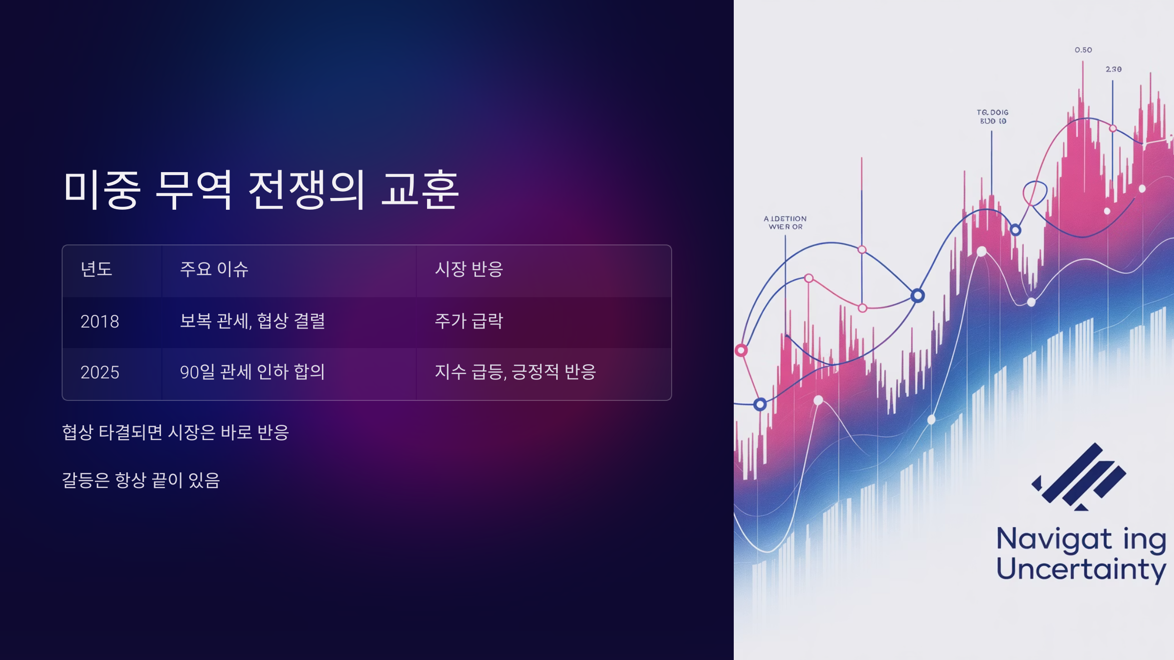 | 2025 | 90일 관세 인하 합의 | 지수 급등, 긍정적 반응 |