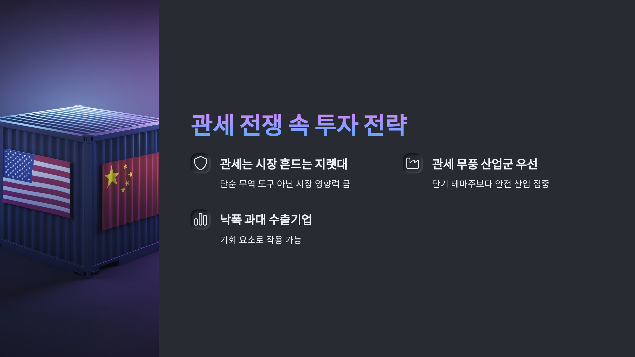 단기 테마주 매수보다는 관세 무풍 지대에 위치한 산업군을 우선 살펴야 합니다.