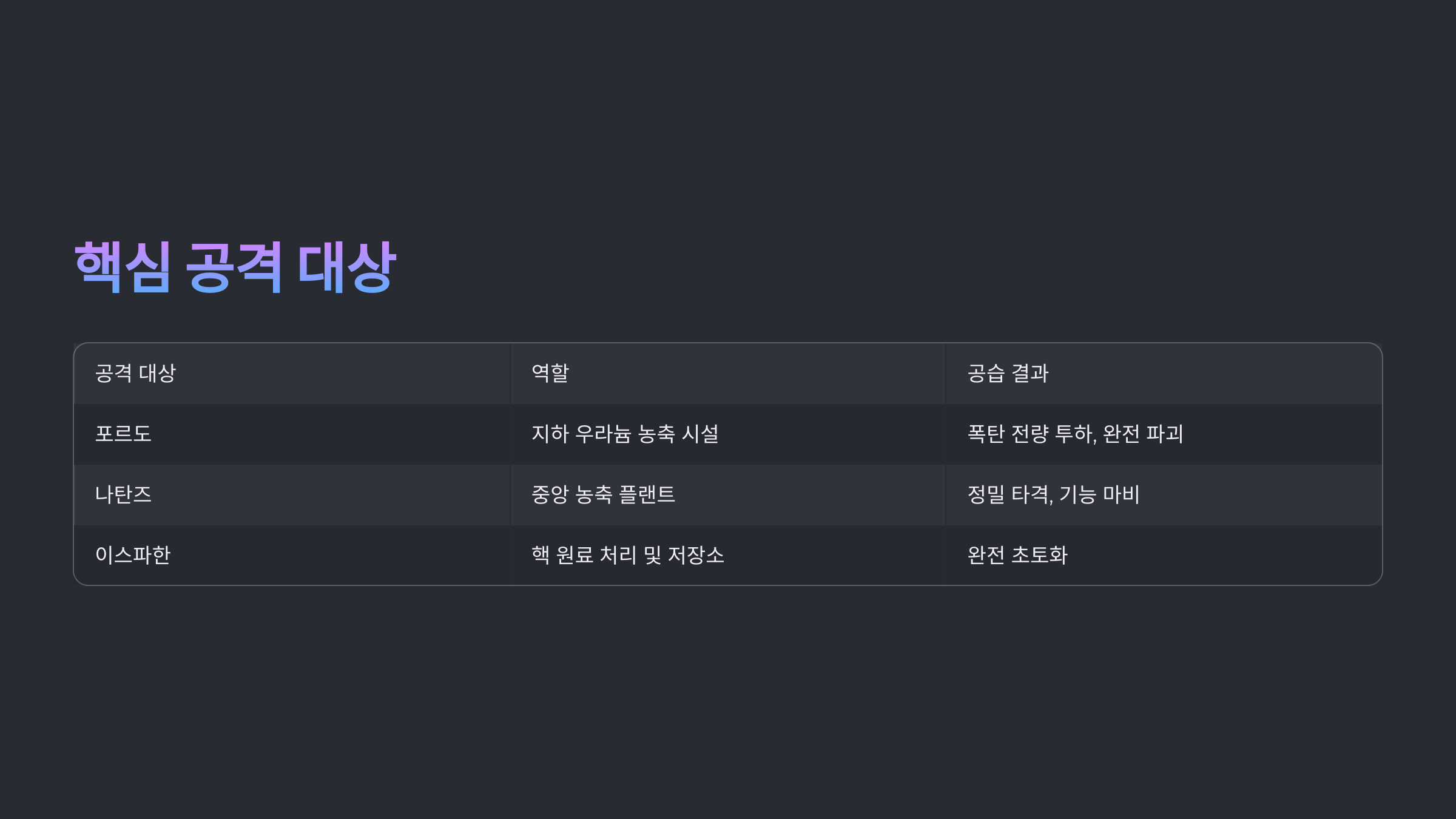 | 나탄즈 | 중앙 농축 플랜트 | 정밀 타격, 기능 마비 |