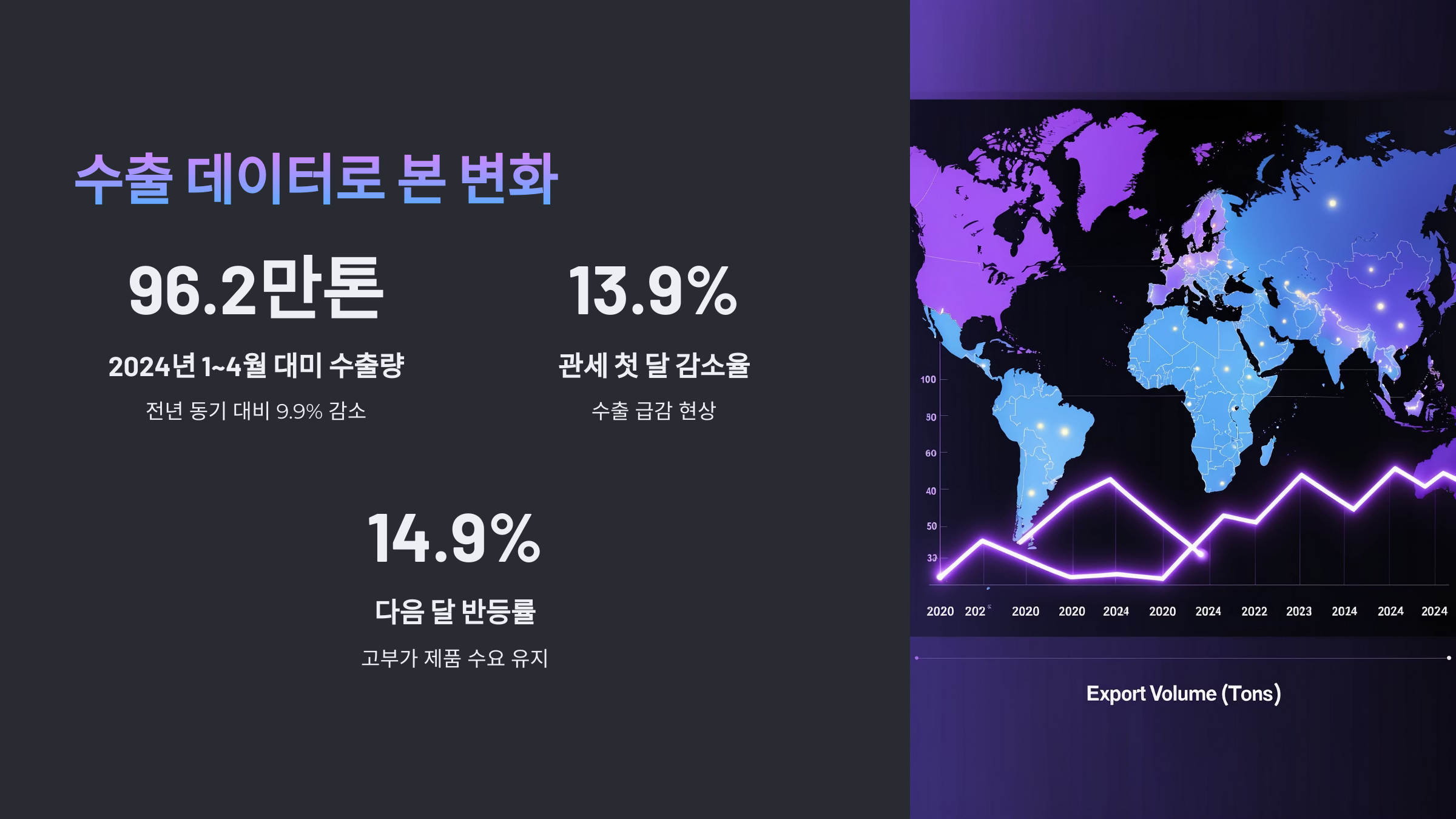 • 2024년 1~4월 대미 수출량 96만2천 톤 (전년 동기 대비 9.9% 감소)