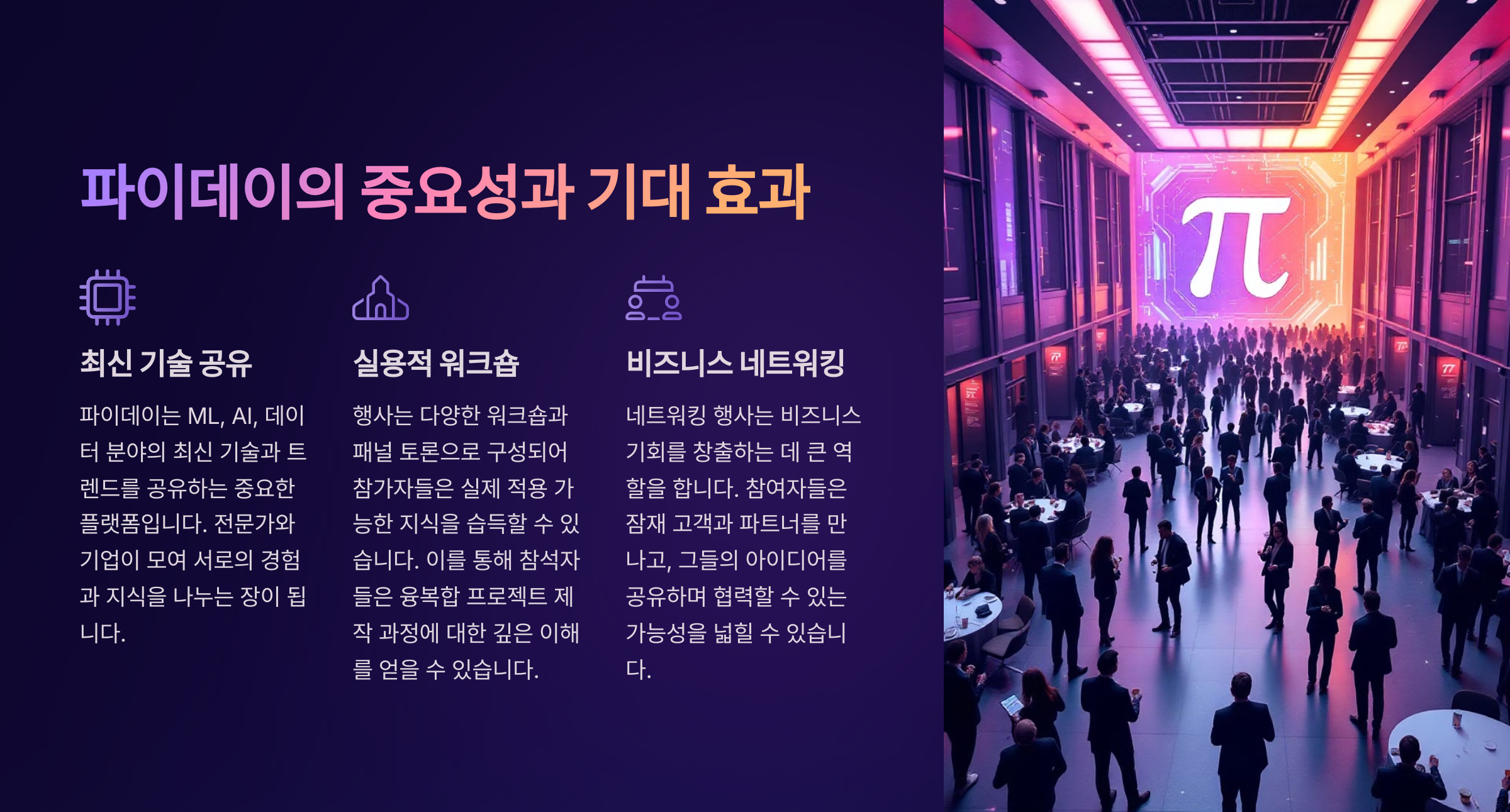 파이데이는 최신 기술과 트렌드를 공유하는 중요한 플랫폼입니다. 특히 ML, AI, 데이터 분야의 전문가와 기업이 모여, 서로의 경험과 지식을 나누는 장이 됩니다.