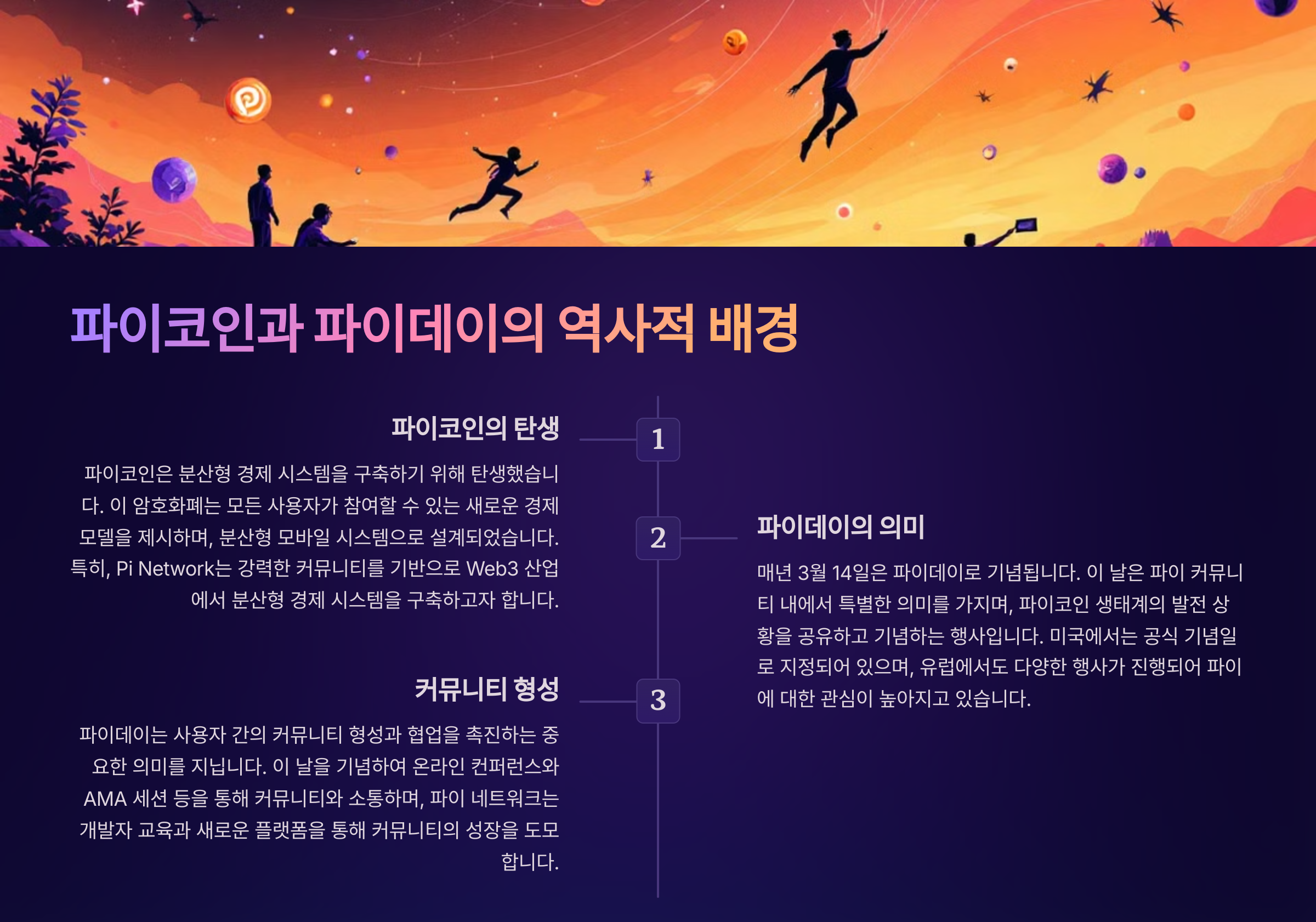 매년 3월 14일은 파이데이로 기념됩니다. 이 날은 파이 커뮤니티 내에서 특별한 의미를 가지며, 파이코인 생태계의 발전 상황을 공유하고 기념하는 행사입니다. 파이데이는 프로젝트 커뮤니티가 주도하는 연례 행사로, 투자자들의 기대 심리를 반영하여 가격 상승이 자주 일어나는 경향이 있습니다. 미국에서는 공식 기념일로 지정되어 있으며, 유럽에서도 다양한 행사가 진행되어 파이에 대한 관심이 높아지고 있습니다.