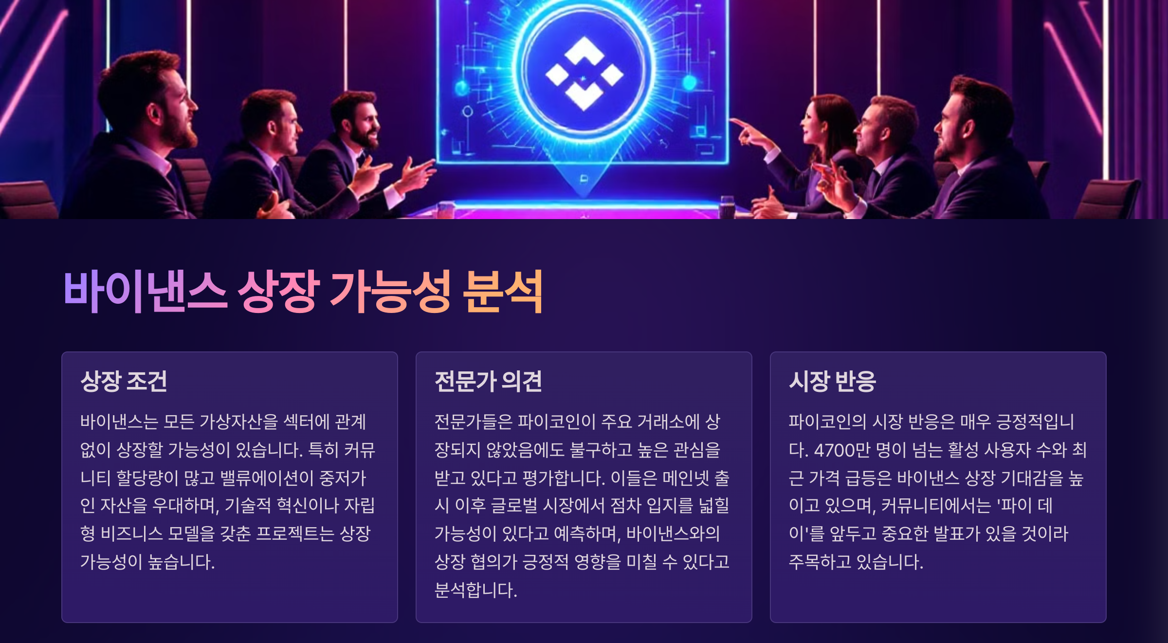 전문가들의 의견을 수집한 결과, 파이코인은 주요 거래소에 상장되지 않았음에도 불구하고 높은 관심을 받고 있습니다. 이들은 메인넷 출시 이후 글로벌 시장에서 점차 입지를 넓힐 가능성이 있다고 예측하며, 바이낸스와의 상장 협의가 긍정적 영향을 미칠 수 있다고 분석합니다.