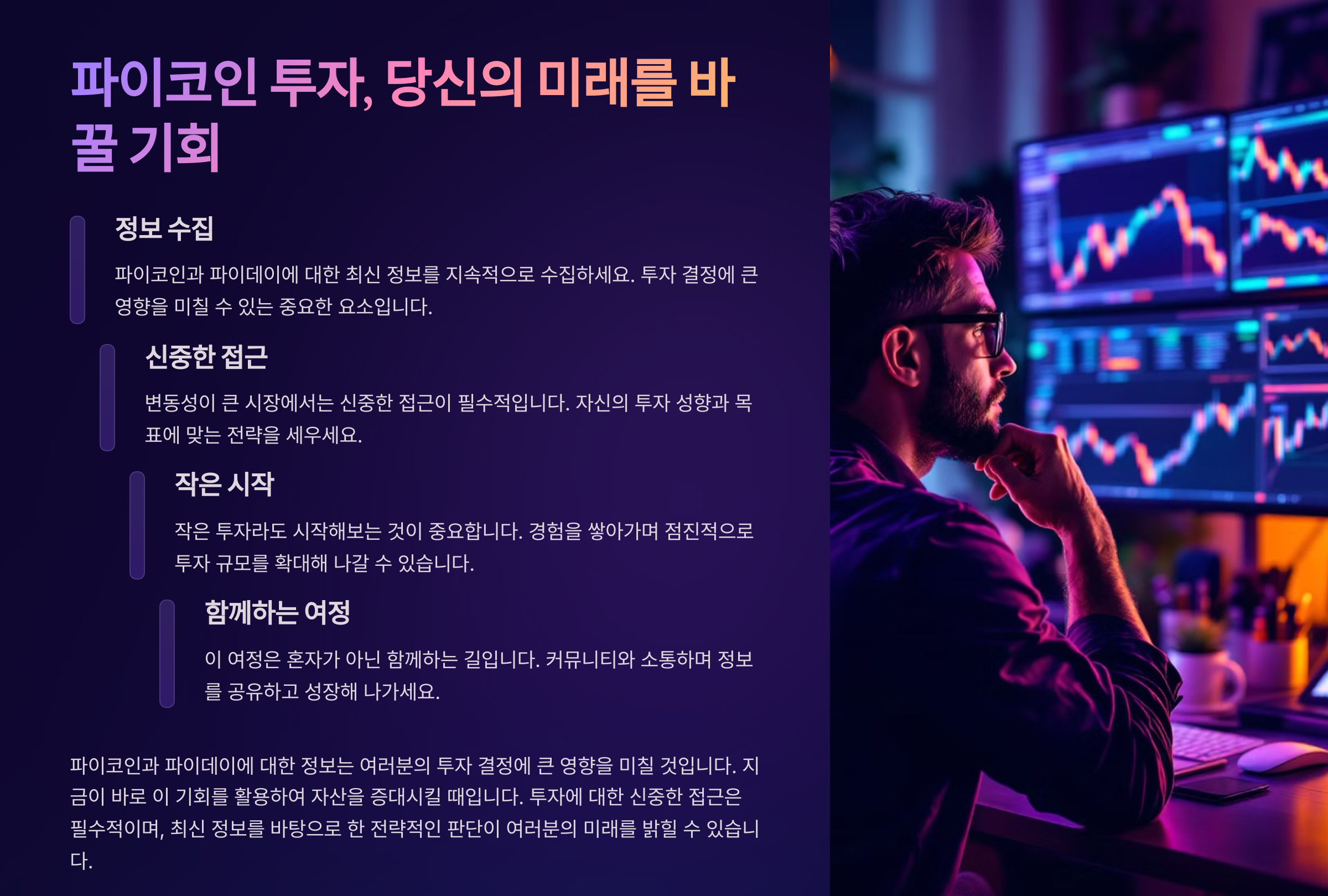 여러분이 파이코인에 주목하고, 작은 투자라도 시작해보는 것은 어떨까요? 변동성이 큰 시장에서 신중하게 접근하여, 여러분의 자산을 키워나가는 기회를 놓치지 마시기 바랍니다.