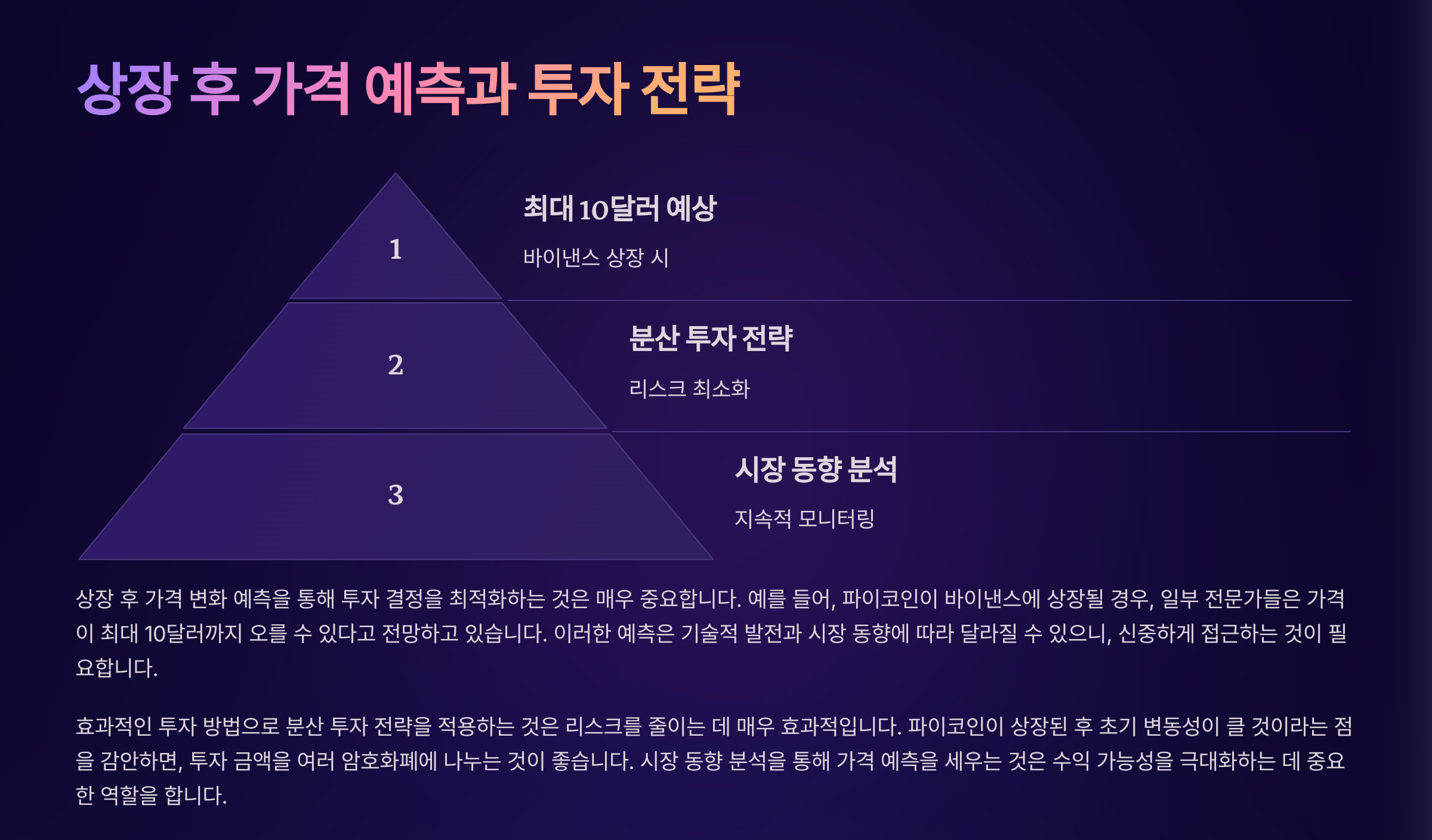상장 후 가격 변화 예측을 통해 투자 결정을 최적화하는 것은 매우 중요합니다. 예를 들어, 파이코인이 바이낸스에 상장될 경우, 일부 전문가들은 가격이 최대 10달러까지 오를 수 있다고 전망하고 있습니다. 이러한 예측은 기술적 발전과 시장 동향에 따라 달라질 수 있으니, 신중하게 접근하는 것이 필요합니다.