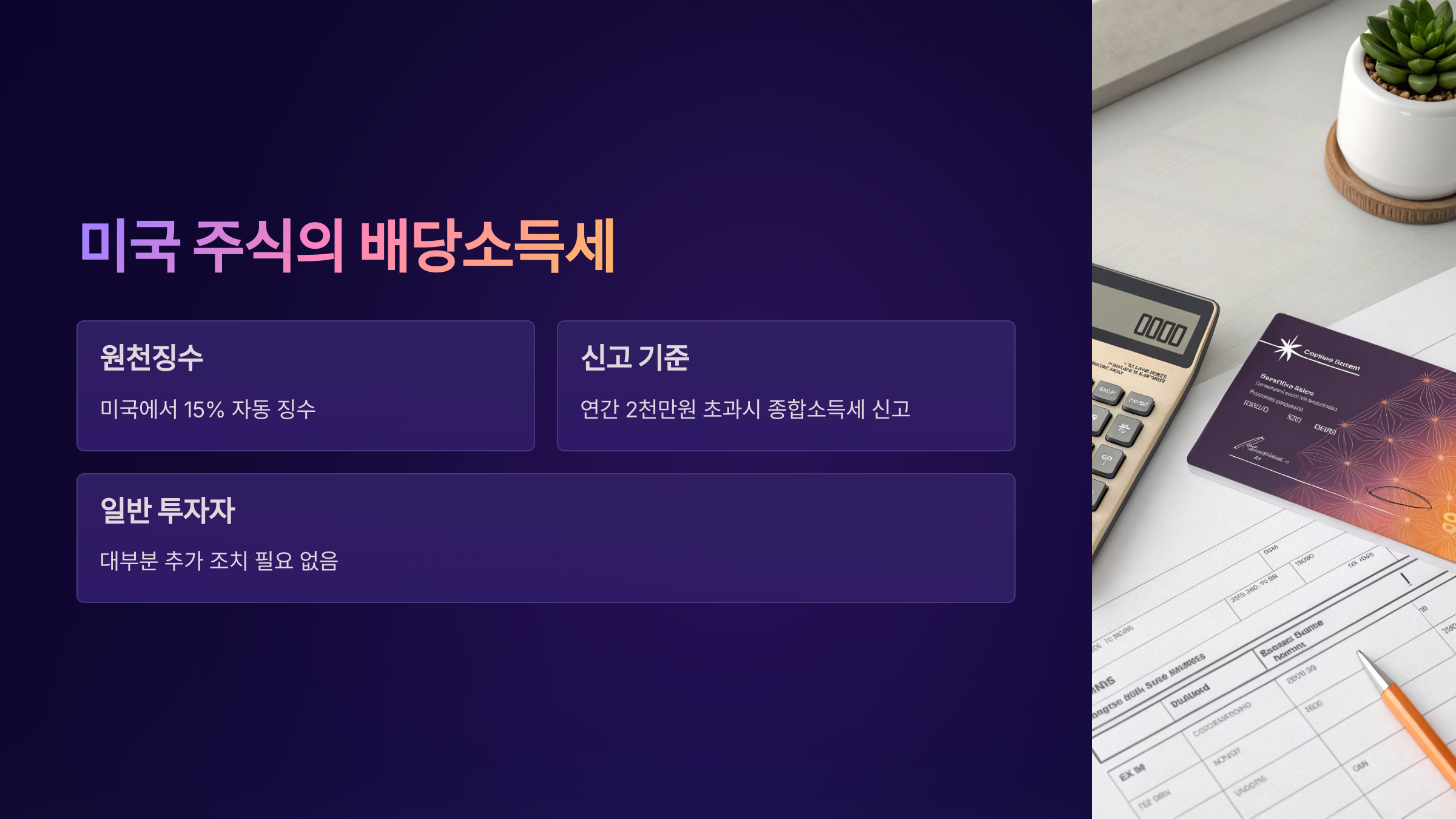 다만 연간 배당금이 2천만 원을 초과하는 경우에는 우리나라에서 종합소득세 신고를 해야 해요.