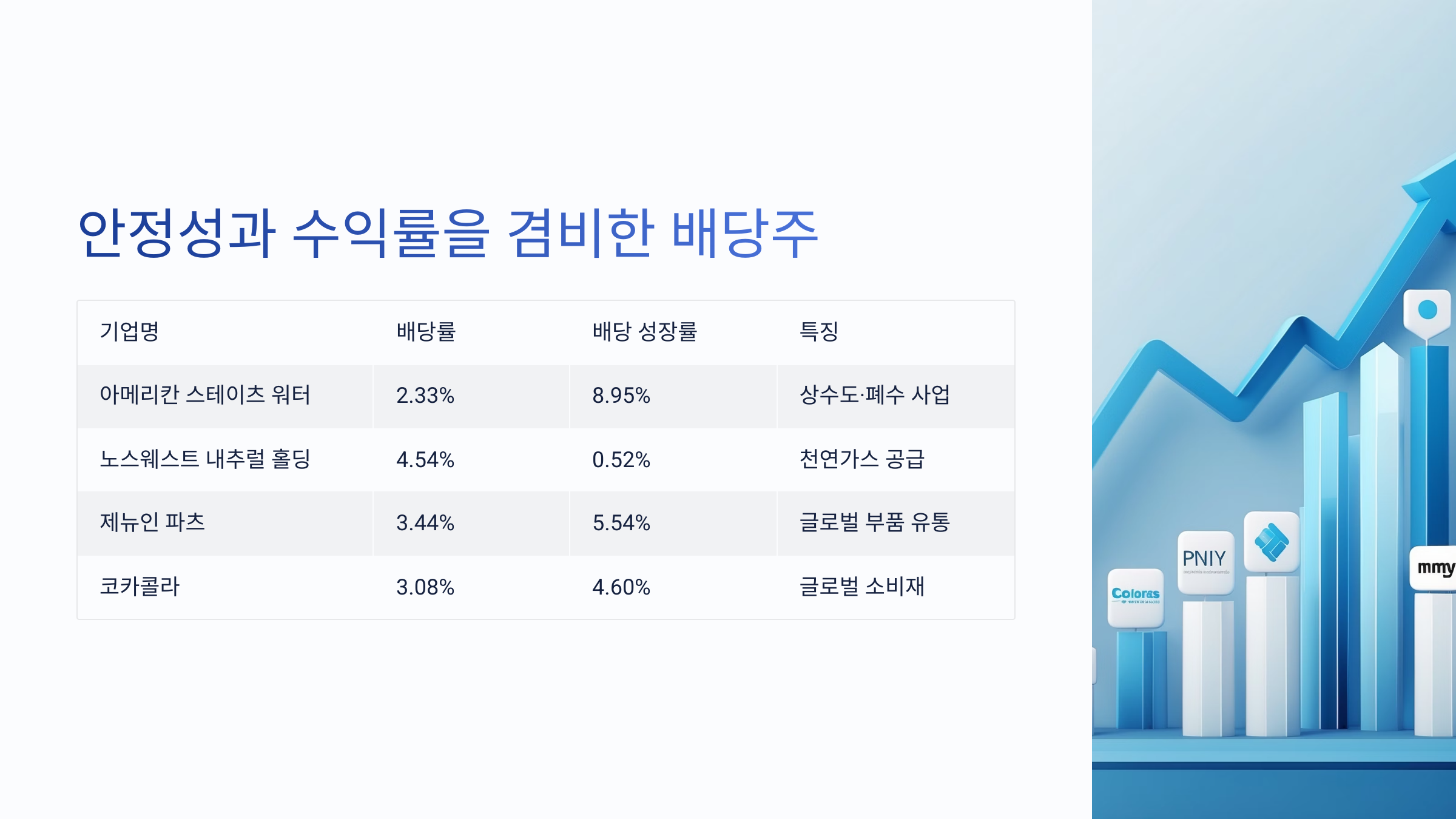 | 기업명 | 배당률 | 배당 성장률 | 특징 |