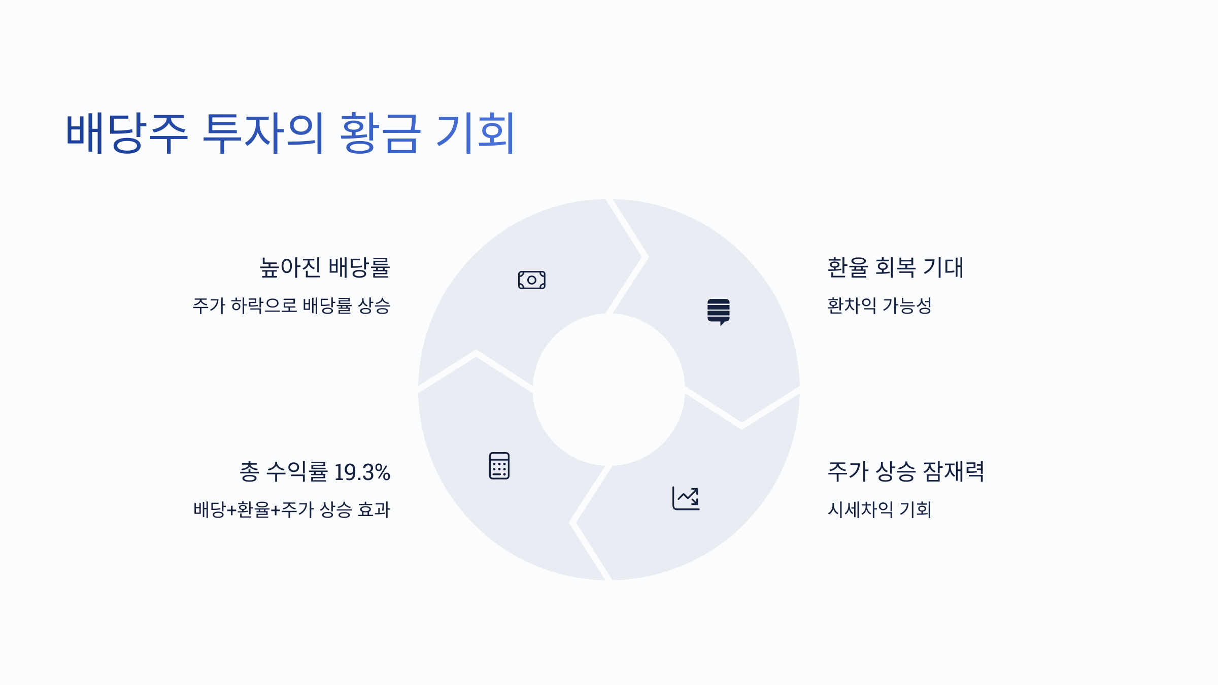 - 배당률 5% + 환율 회복 + 주가 상승 = 시세차익 19.3%