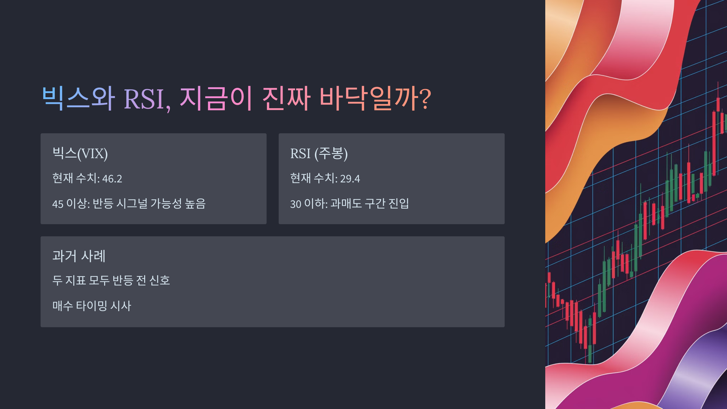 | VIX (공포 지수) | 46.2 | 반등 시그널 가능성 높음 |