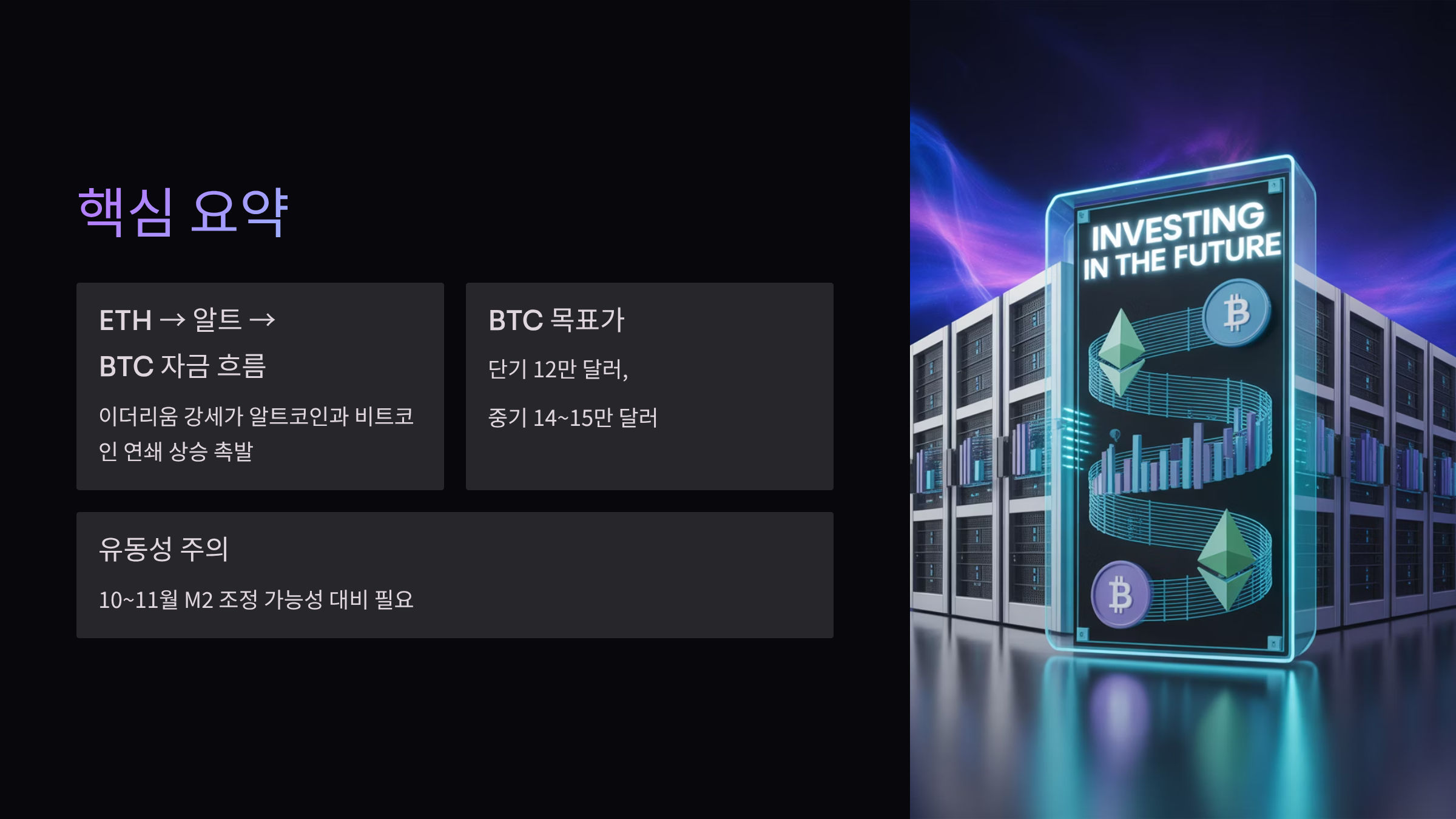 • ETH 상승 초기에는 알트코인 비중 확대 전략 고려.