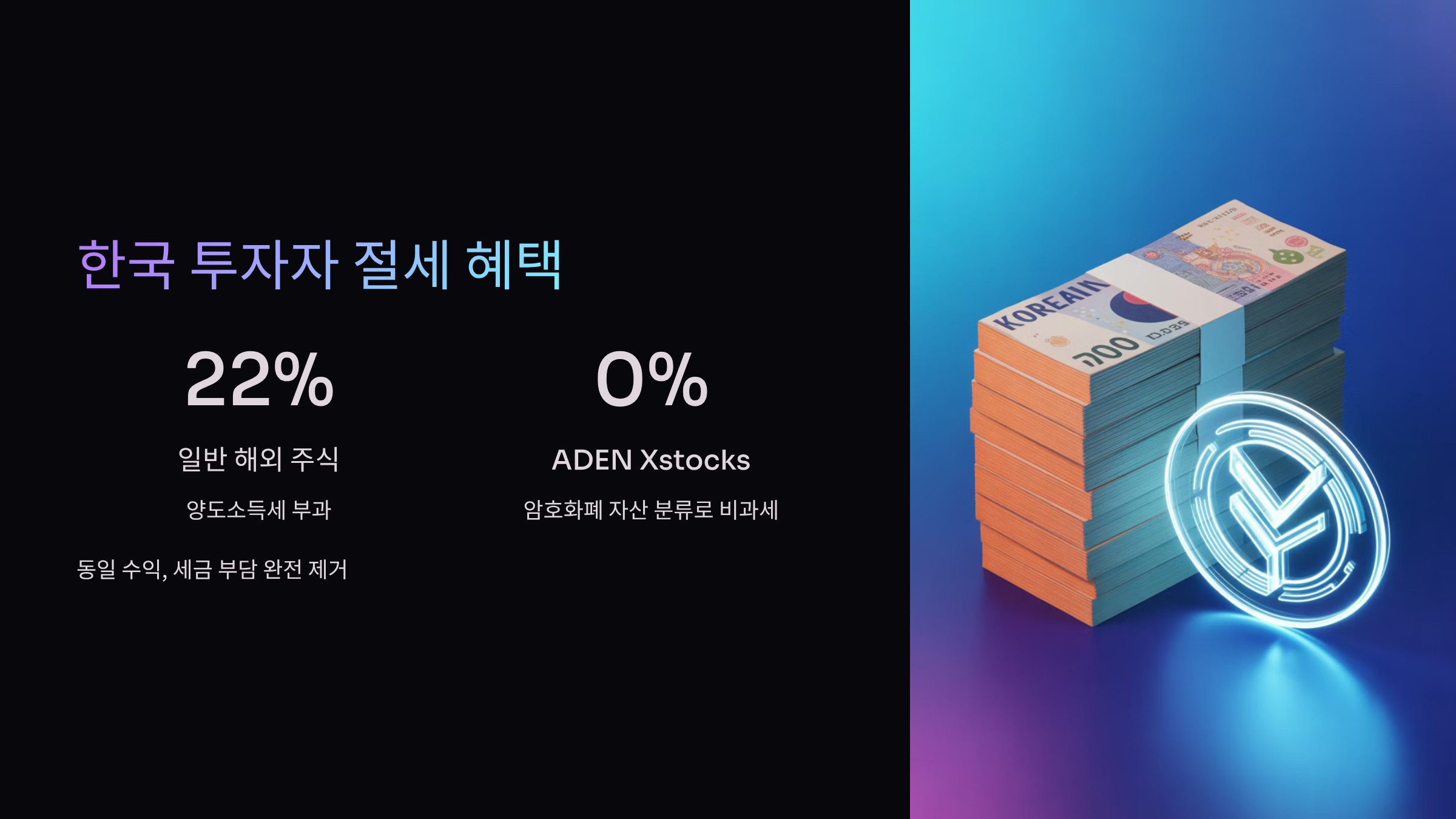 하지만 ADEN에서 거래되는 미국 주식 파생상품(Xstocks)은 암호화폐 자산으로 분류되기 때문에,