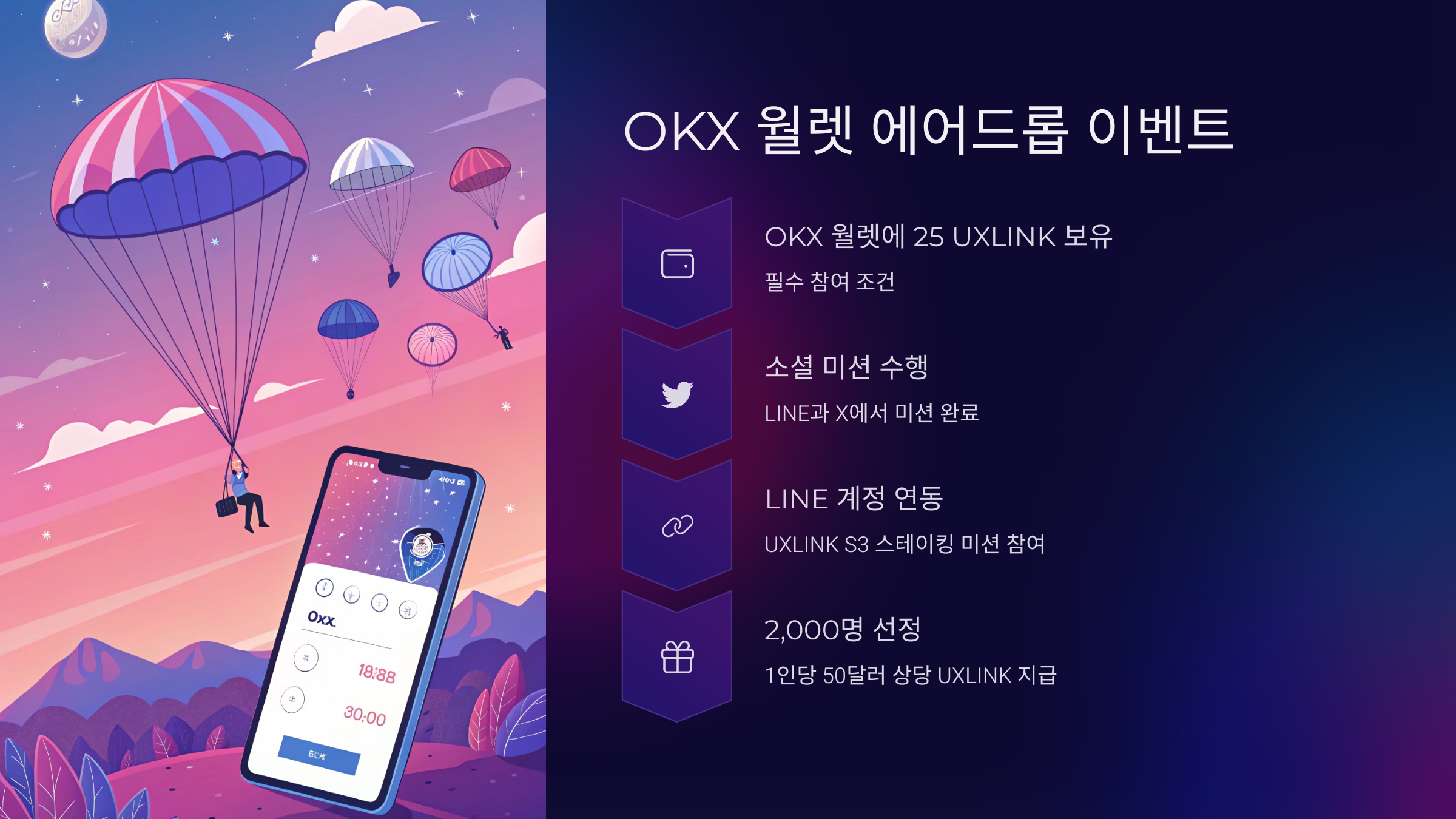 UXLink는 OKX 월렛과 손잡고 시즌 3 에어드롭 이벤트를 진행 중이에요.