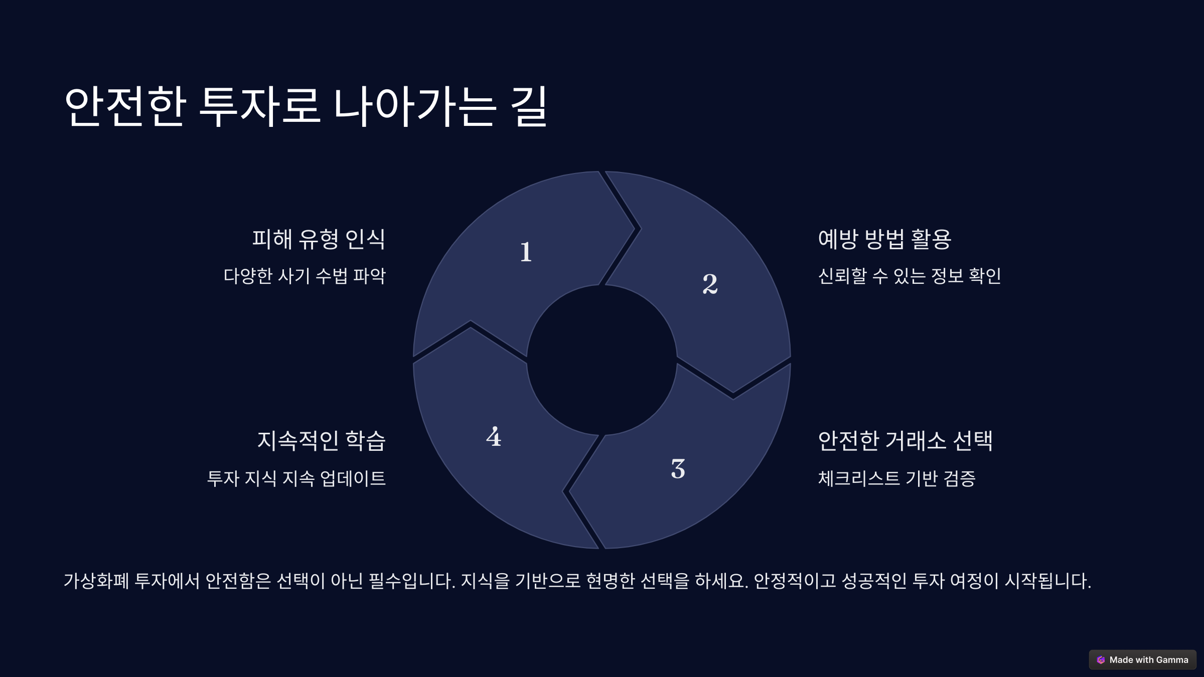 가상화폐 투자에서의 안전함은 선택이 아닌 필수입니다. 이번 글에서 소개한 다양한 피해 유형과 그에 대한 예방 방법, 안전한 거래소 선택 기준을 기억하신다면, 여러분의 투자 여정은 더욱 확고해질 것입니다.