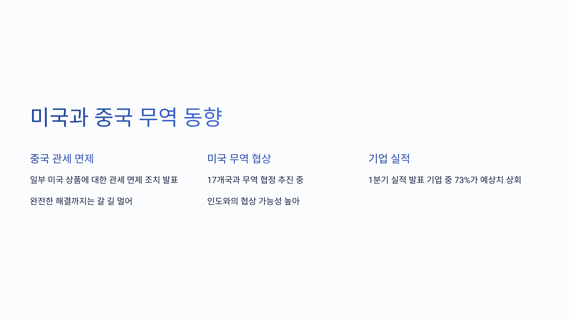 | 무역 동향 | 중국, 일부 미국 상품에 관세 면제 시행. 미국, 17개국과 무역 협상 중 |