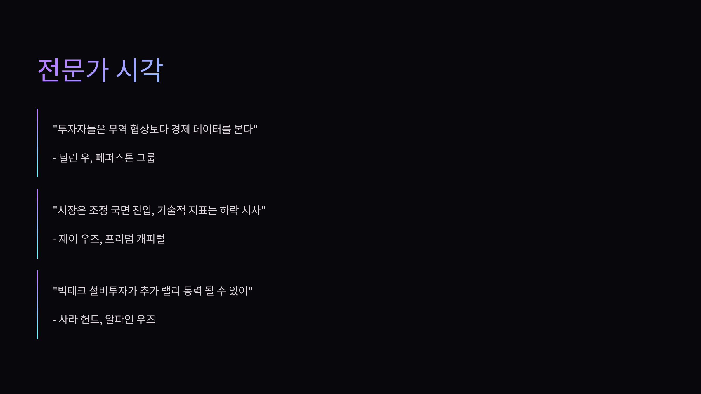 - 사라 헌트 (알파인 우즈 캐피털): “빅테크의 설비투자 발표가 주가 랠리에 추가 동력 될 수 있어.”