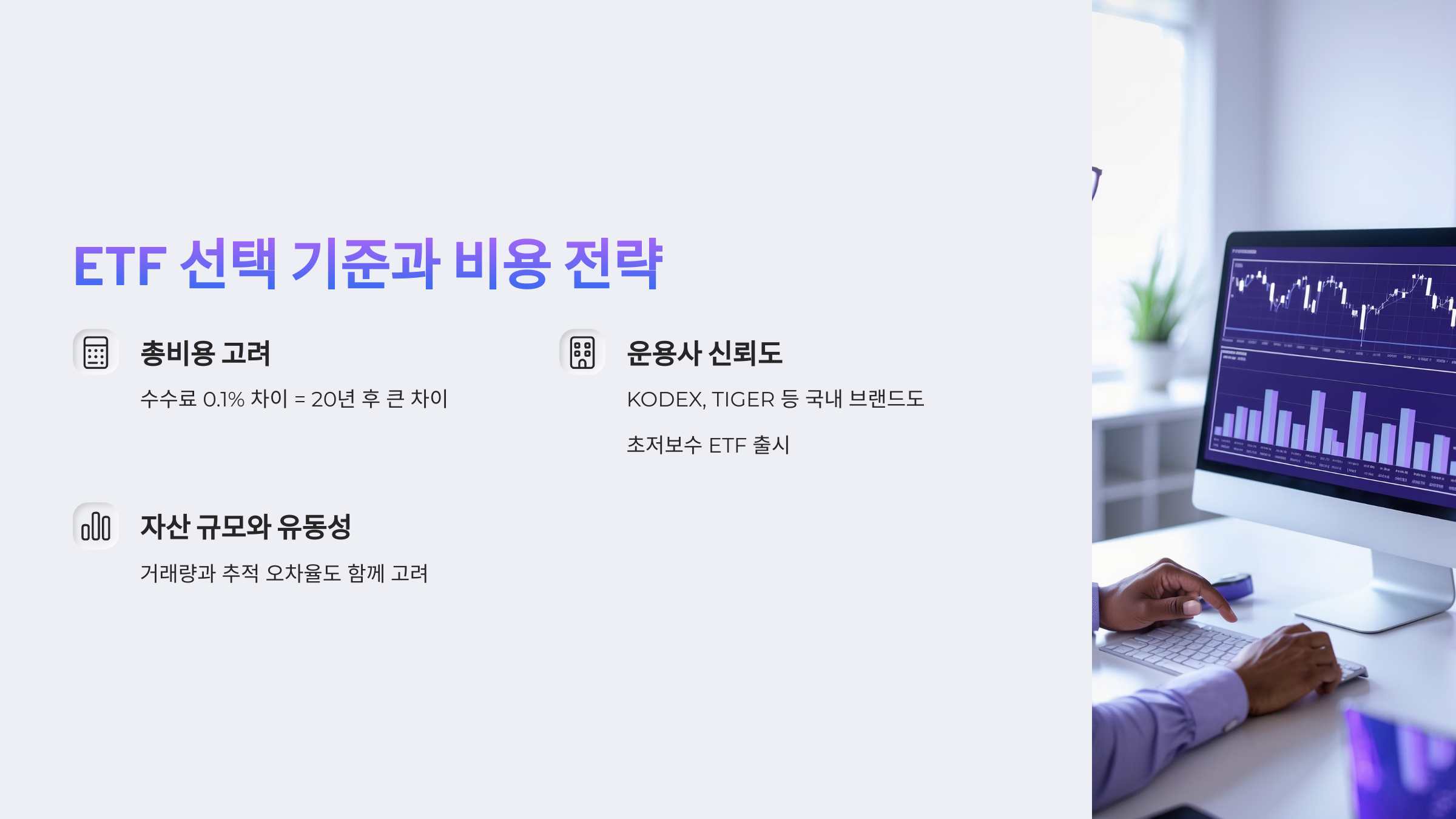ETF를 고를 때 가장 먼저 고려해야 할 건 ‘총비용’이에요.