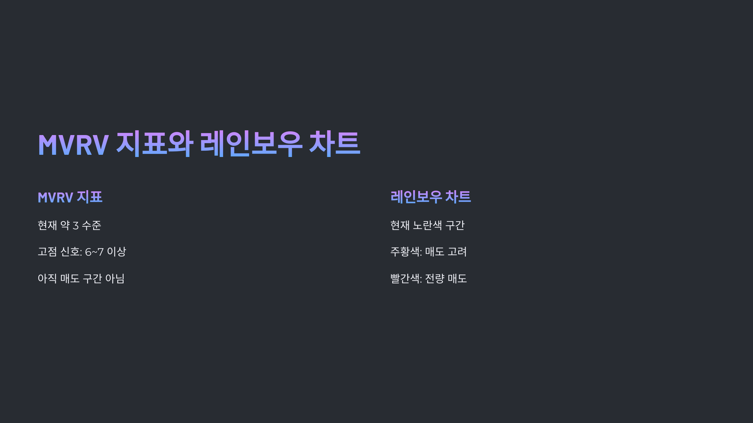 | 분할 매도 시작 | MVRV 6 이상, 주황색 레인보우 진입 시점부터 10~20%씩 분할 매도 |