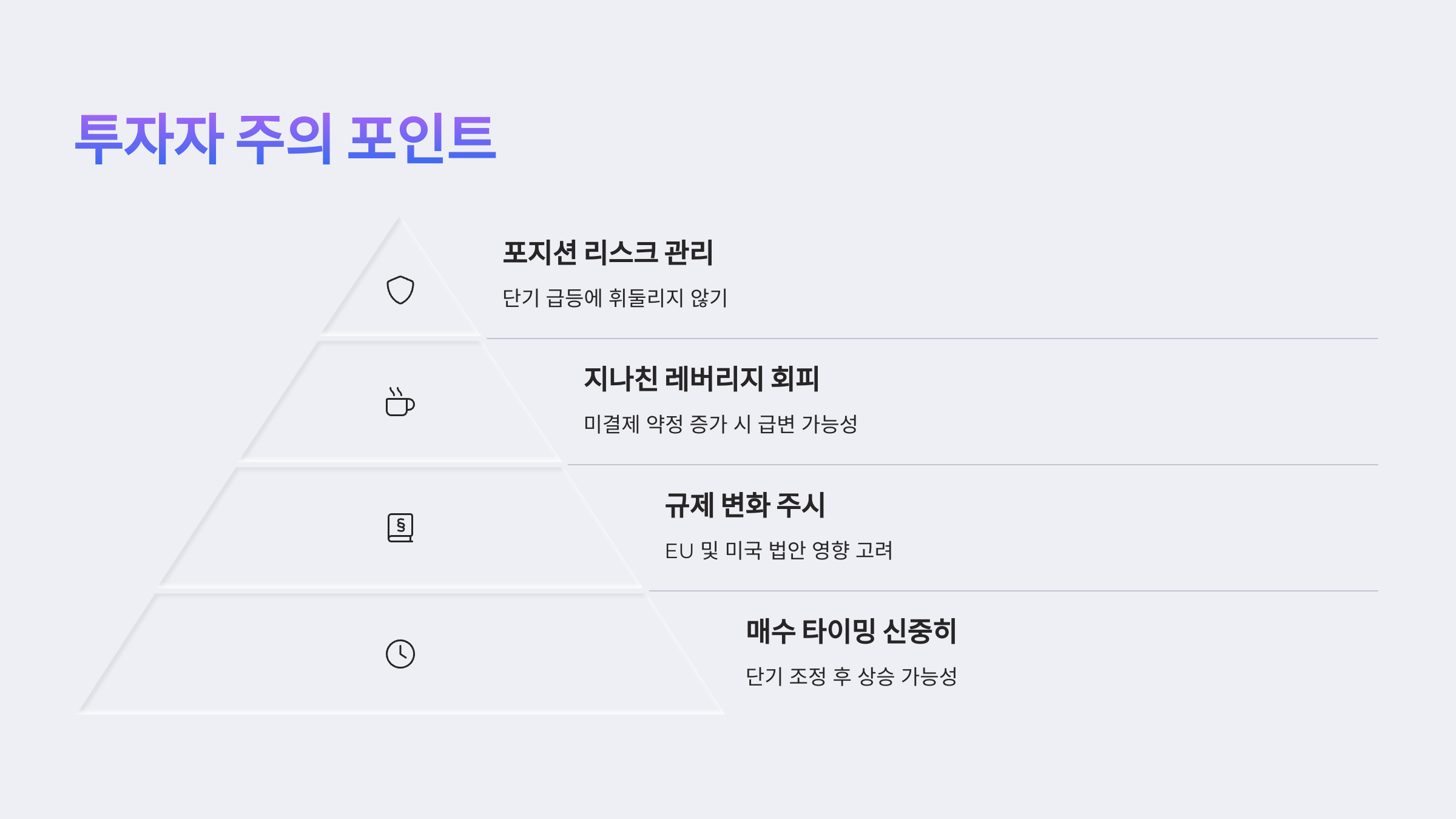 | 규제 변화 주시 | EU 및 미국의 법안은 시장 센티먼트에 영향 |