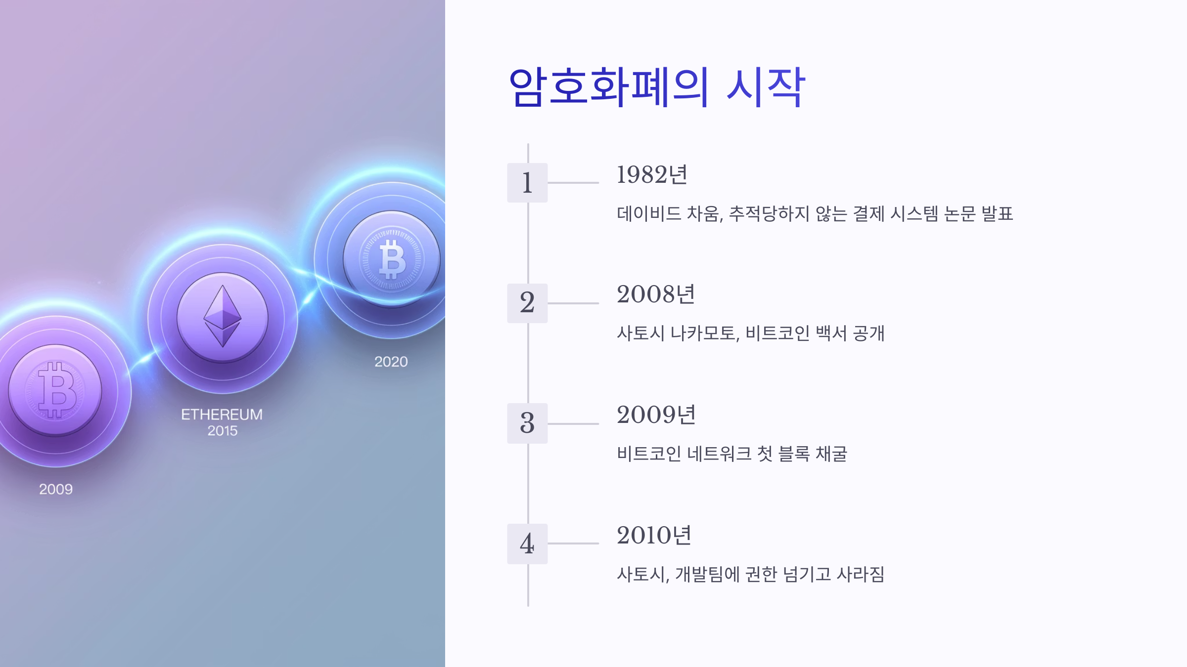 | 2008년 | 비트코인 백서 공개 – “P2P 전자화폐 시스템” 개념 소개 |