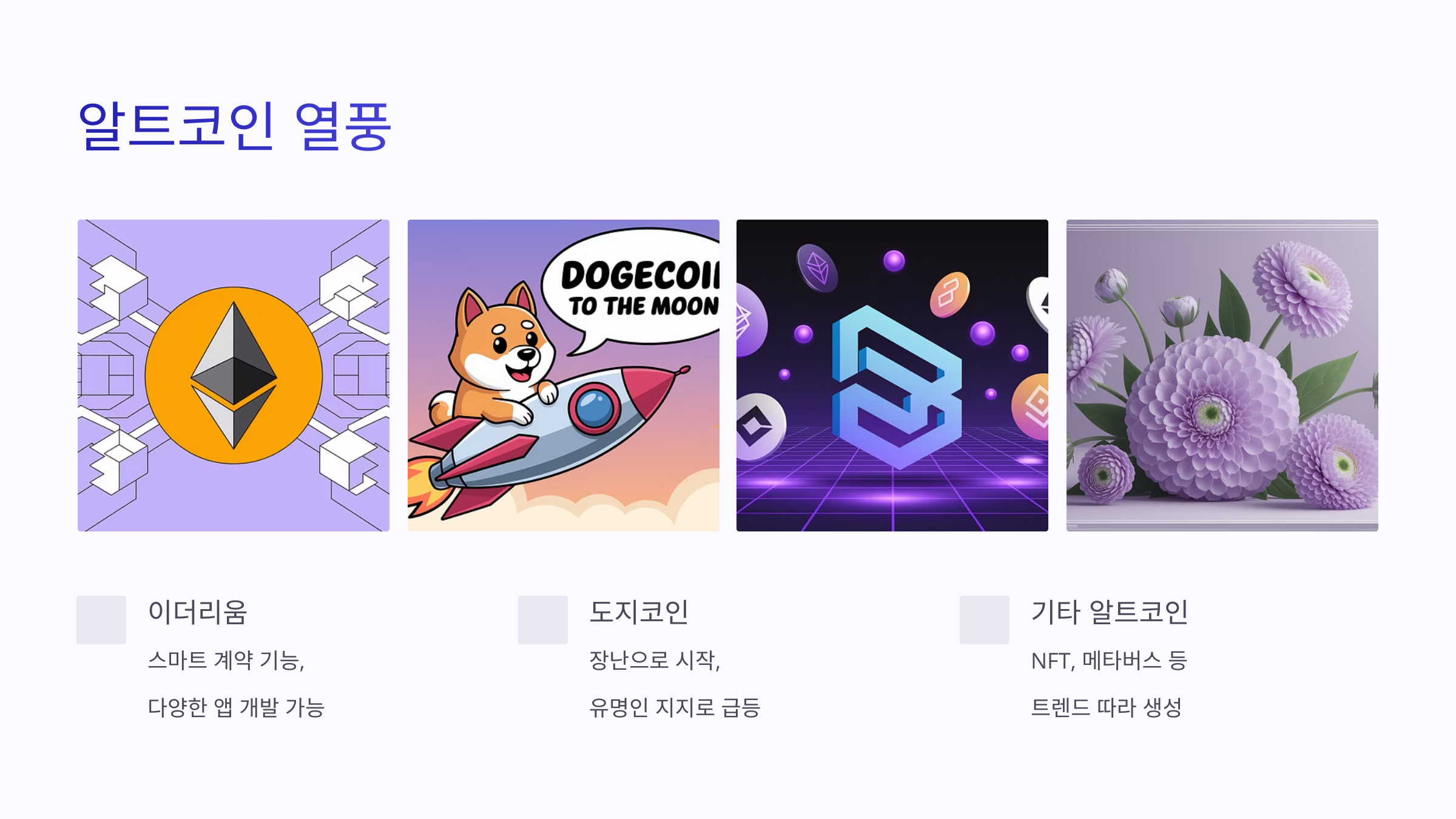 | 기타 알트코인 | NFT, 메타버스 등 트렌드 따라 다양하게 생성 |