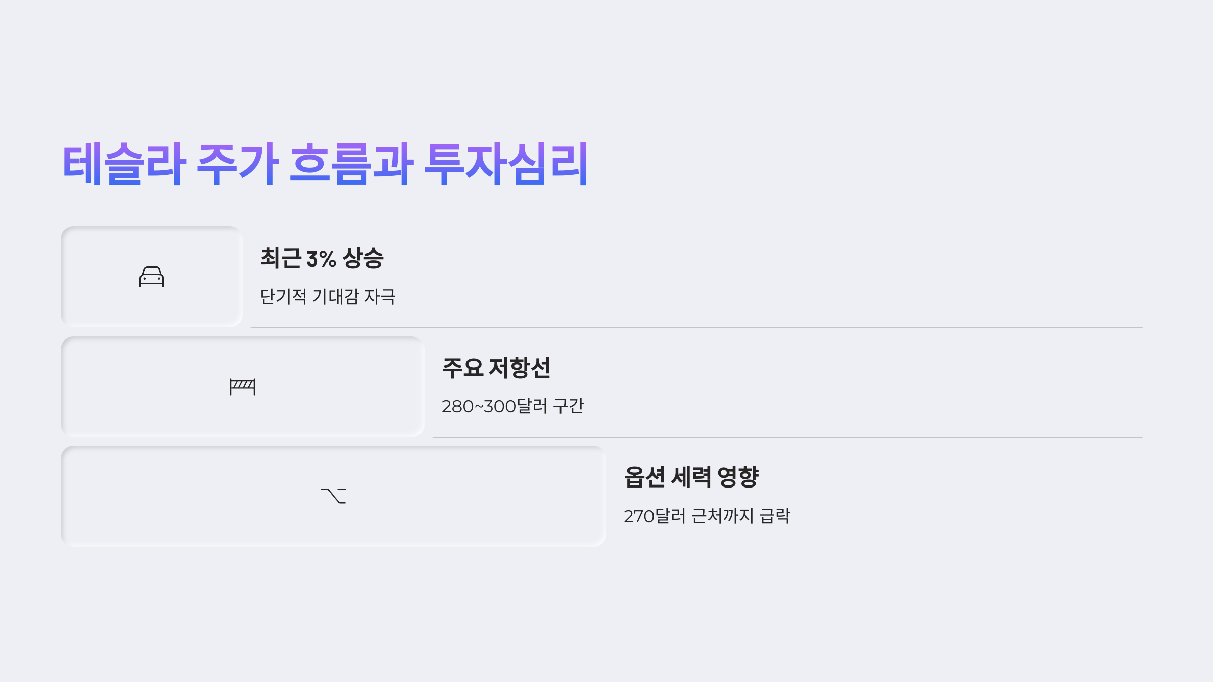 테슬라는 최근 3%가량 상승하며 단기적 기대감을 자극했지만,