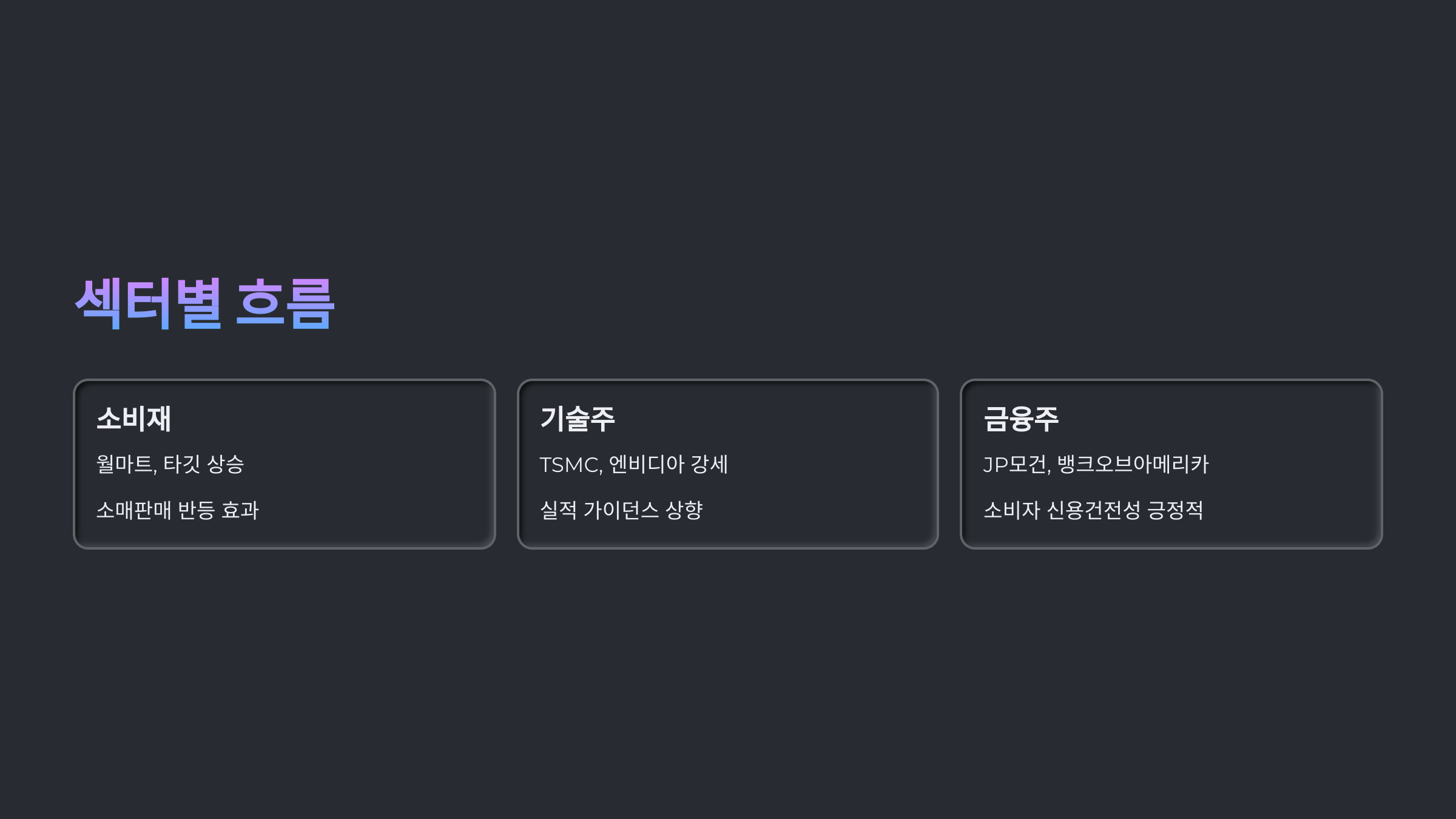 | 금융주 | JP모건, 뱅크오브아메리카 | 소비자 신용건전성 긍정적 평가 |