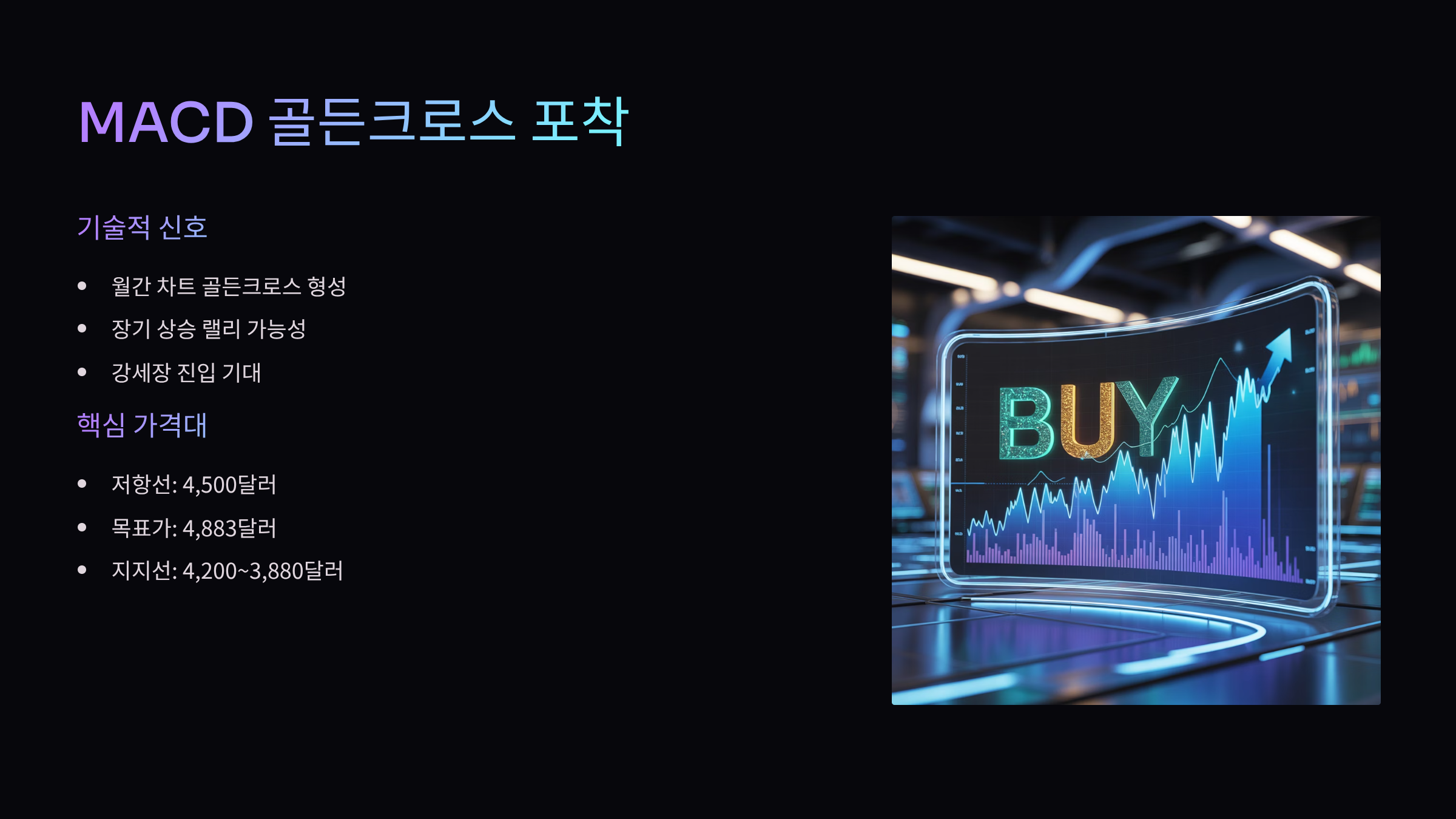 - 신호: MACD 골든크로스 → 장기 랠리 가능성