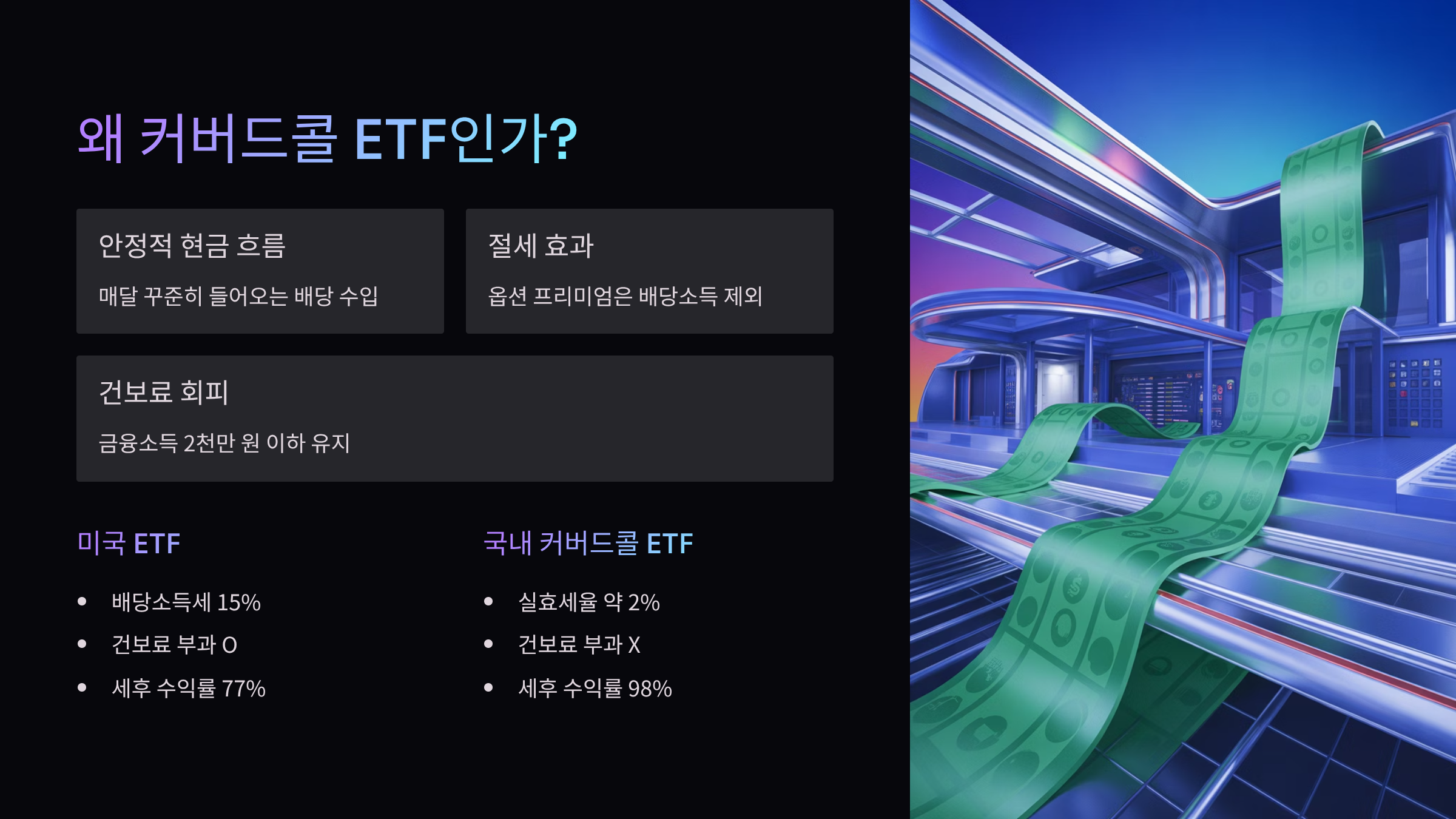 - 국내 커버드콜: 세금 부담 ↓, 건보료 부담 無