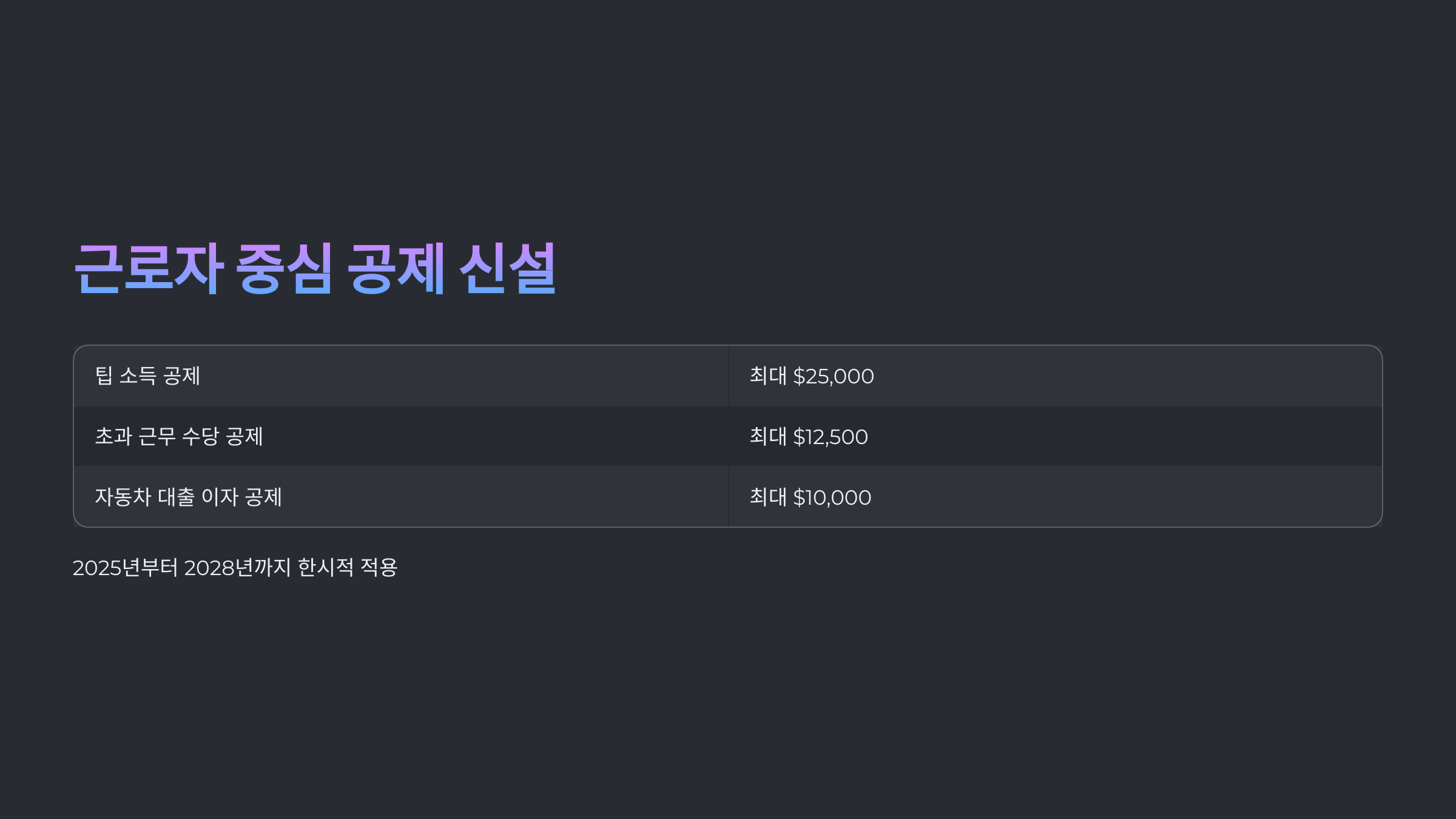 | 자동차 대출 이자 공제 | 미국산 신차 대출이자 최대 $10,000 공제 | 2025~2028년 |