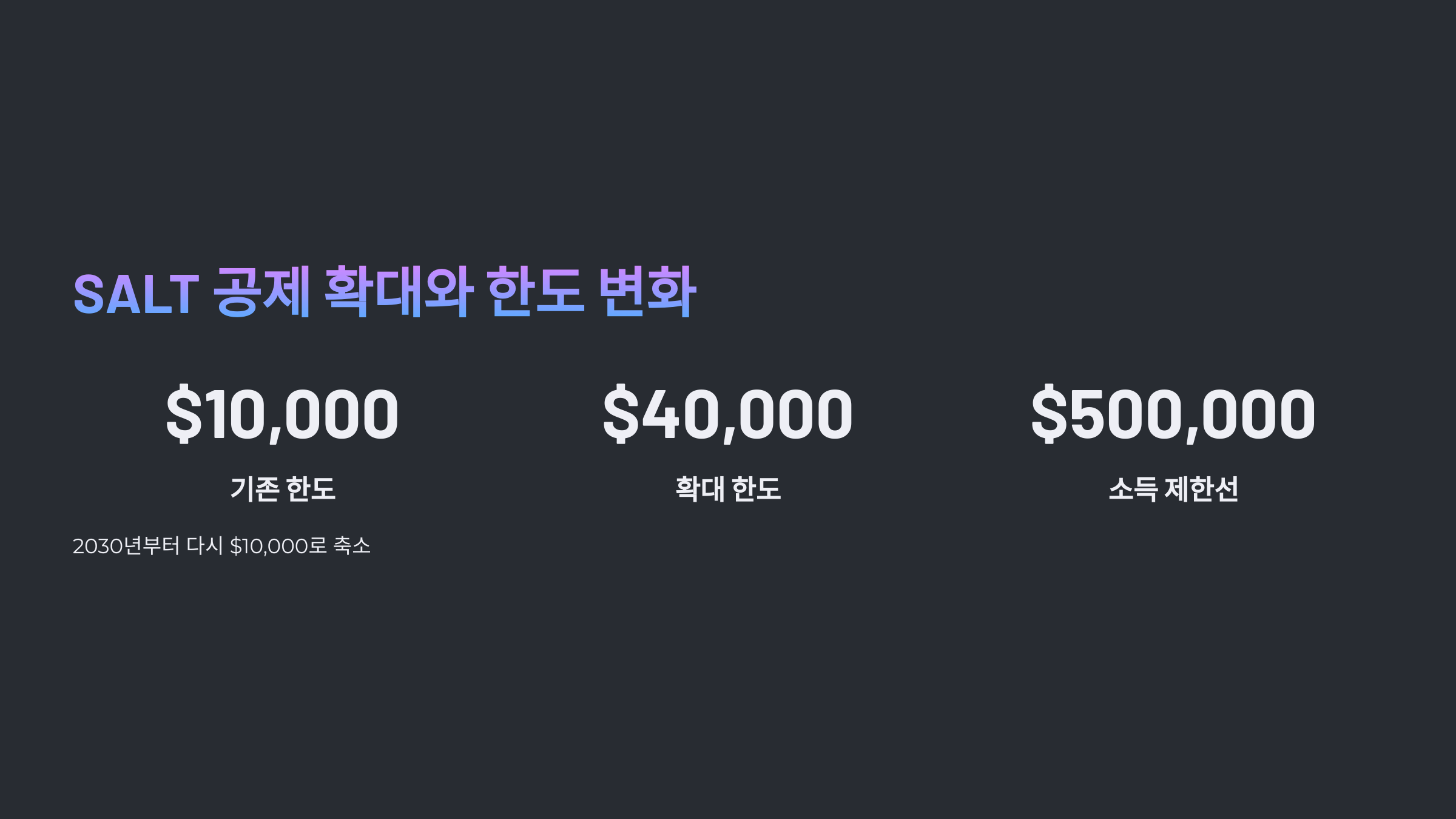 | SALT 공제 한도 | $10,000 | 최대 $40,000 (2030년부터 다시 $10,000) |