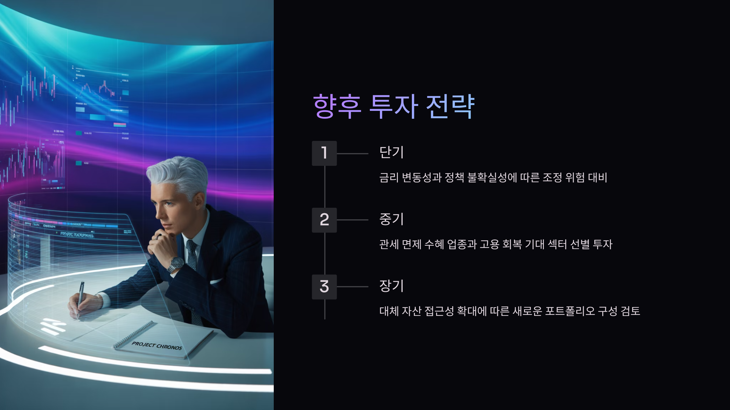 - 중기: 관세 면제 수혜 업종과 고용 회복 기대 섹터 선별 투자