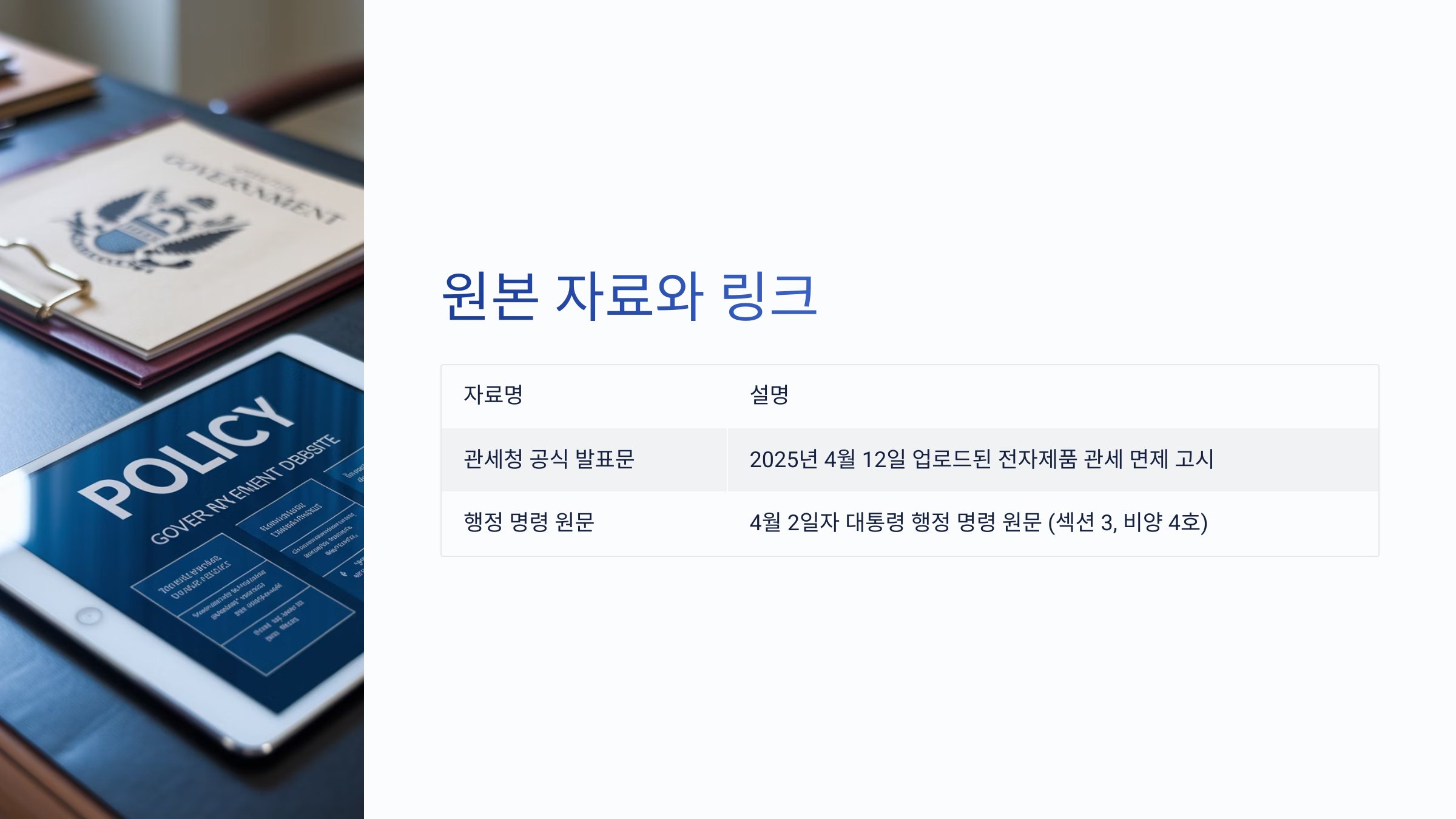 | 관세청 공식 발표문 | 2025년 4월 12일 업로드된 전자제품 관세 면제 고시 |
