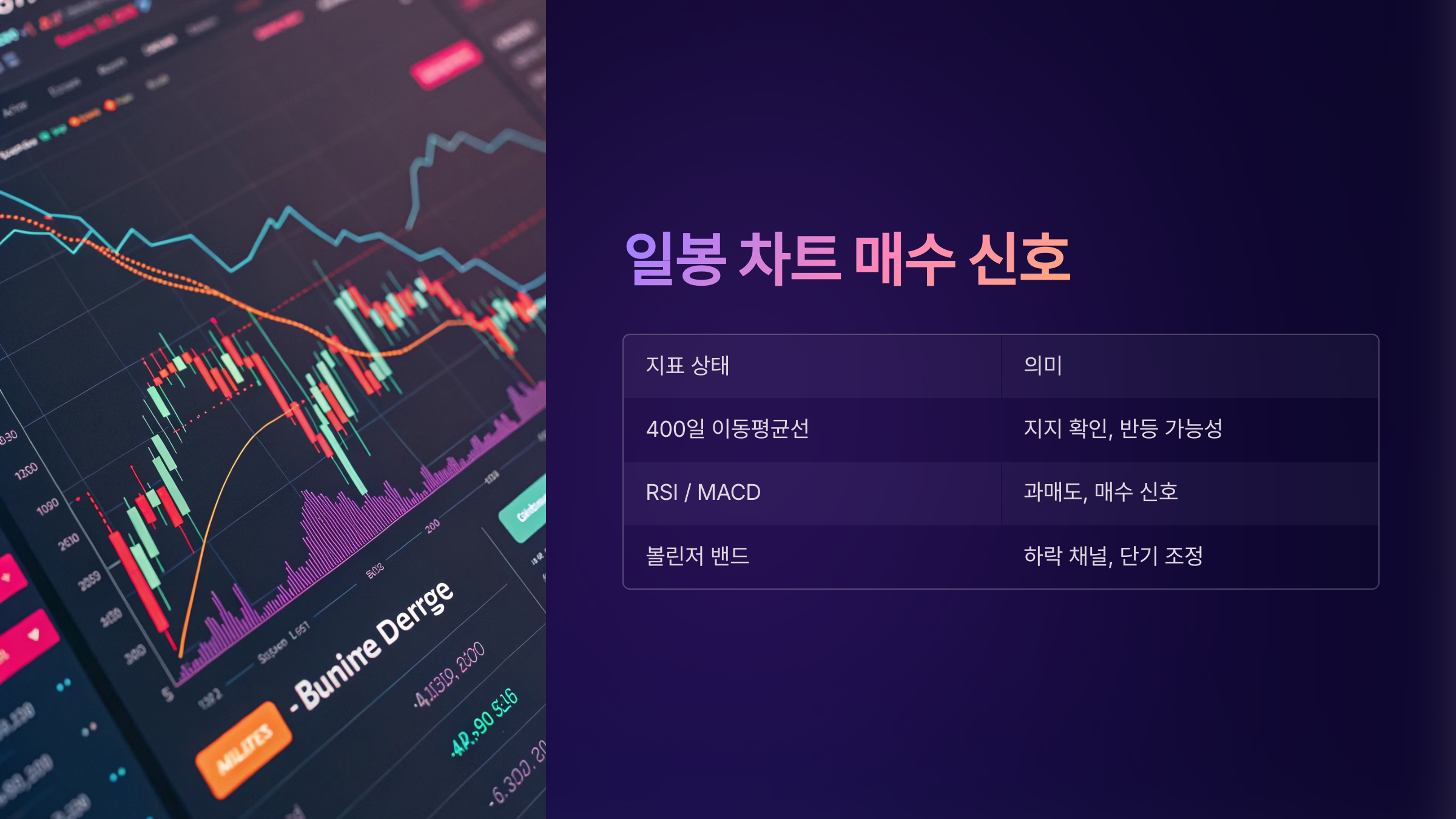 | RSI / MACD | 과매도 | 매수 신호 |