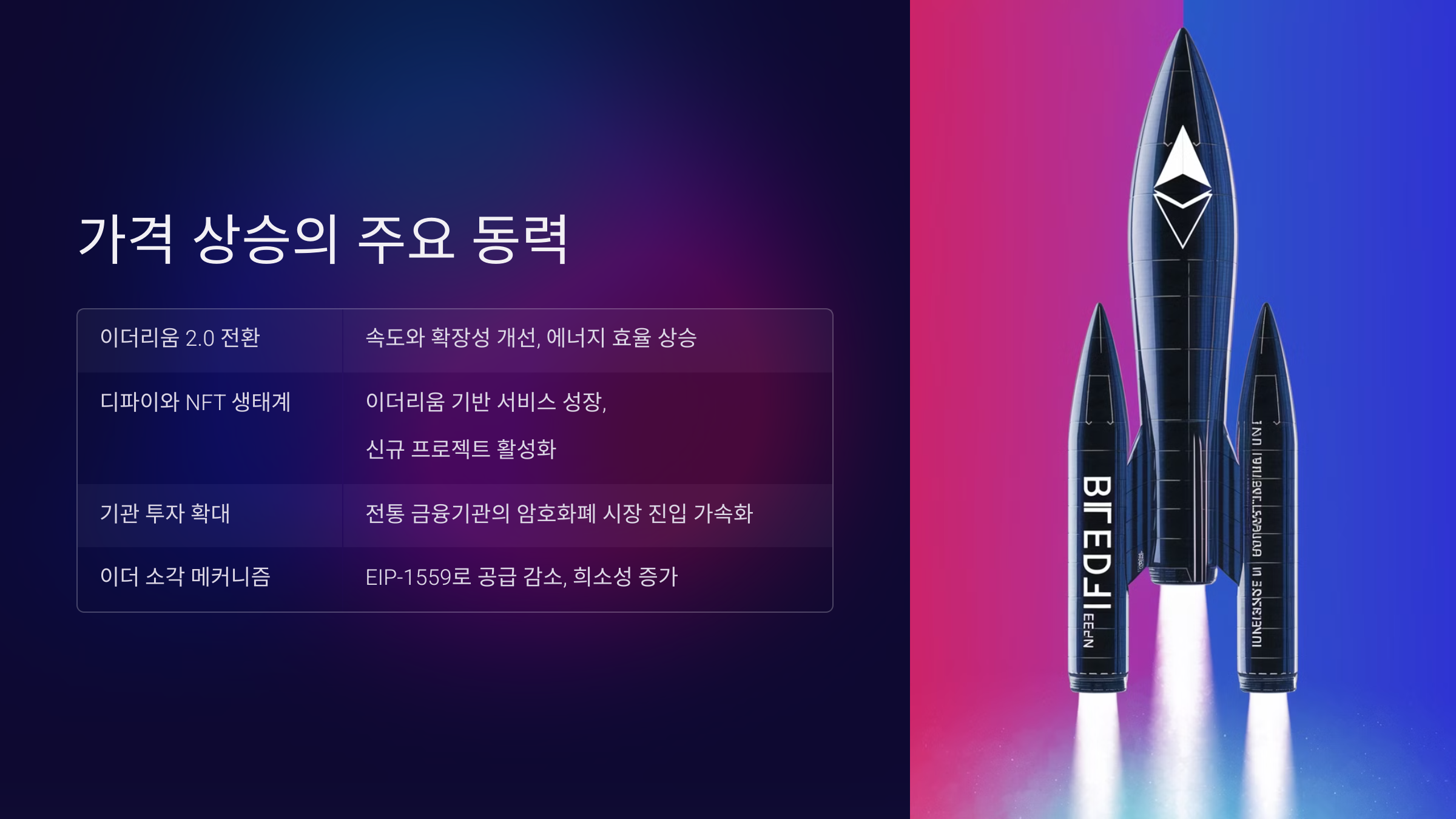 | 이더 소각 메커니즘 | EIP-1559로 인해 공급 감소, 희소성 증가 |