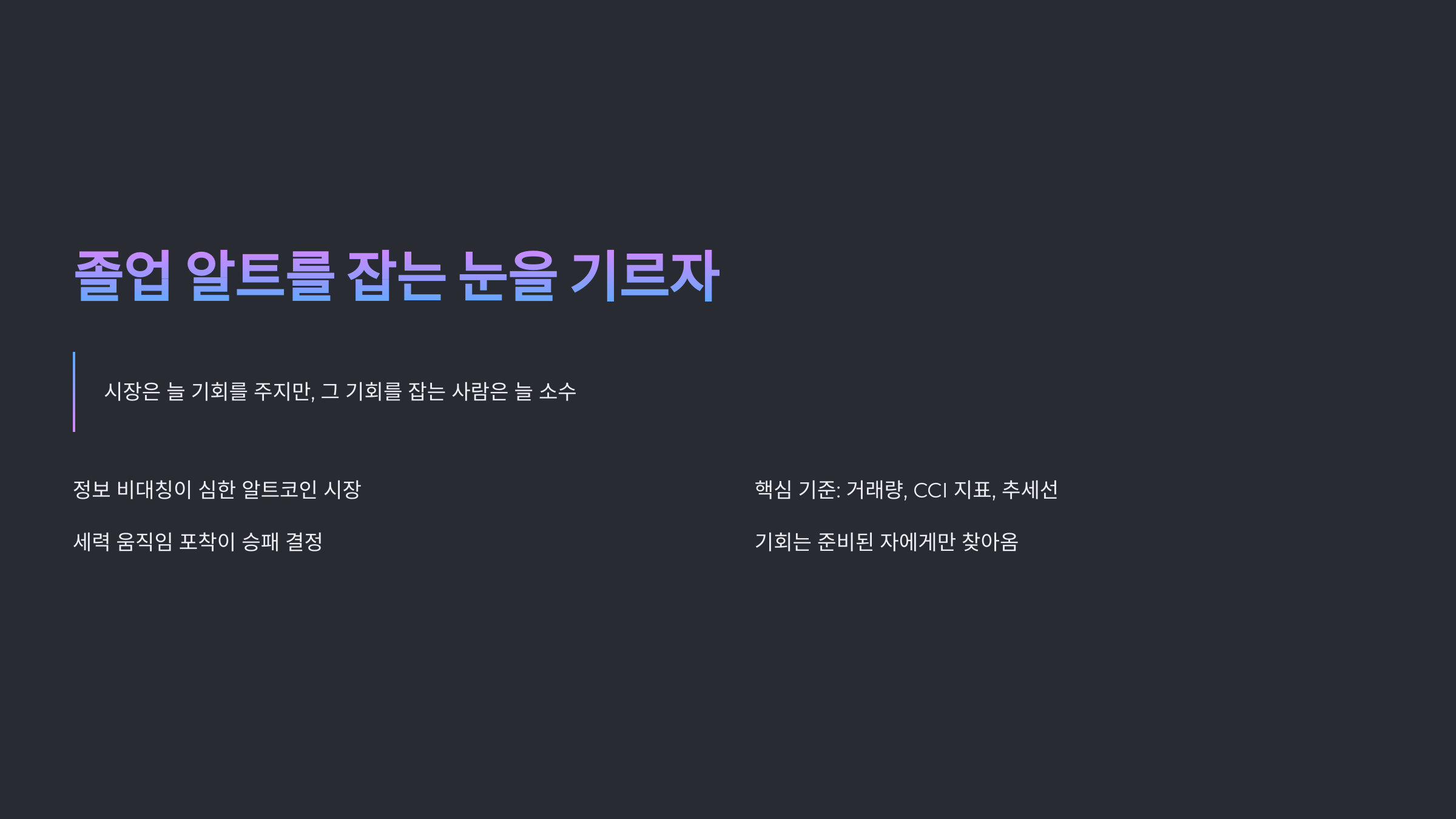 - 시장 전체의 흐름보다는, 개별 코인의 구조와 특성에 집중