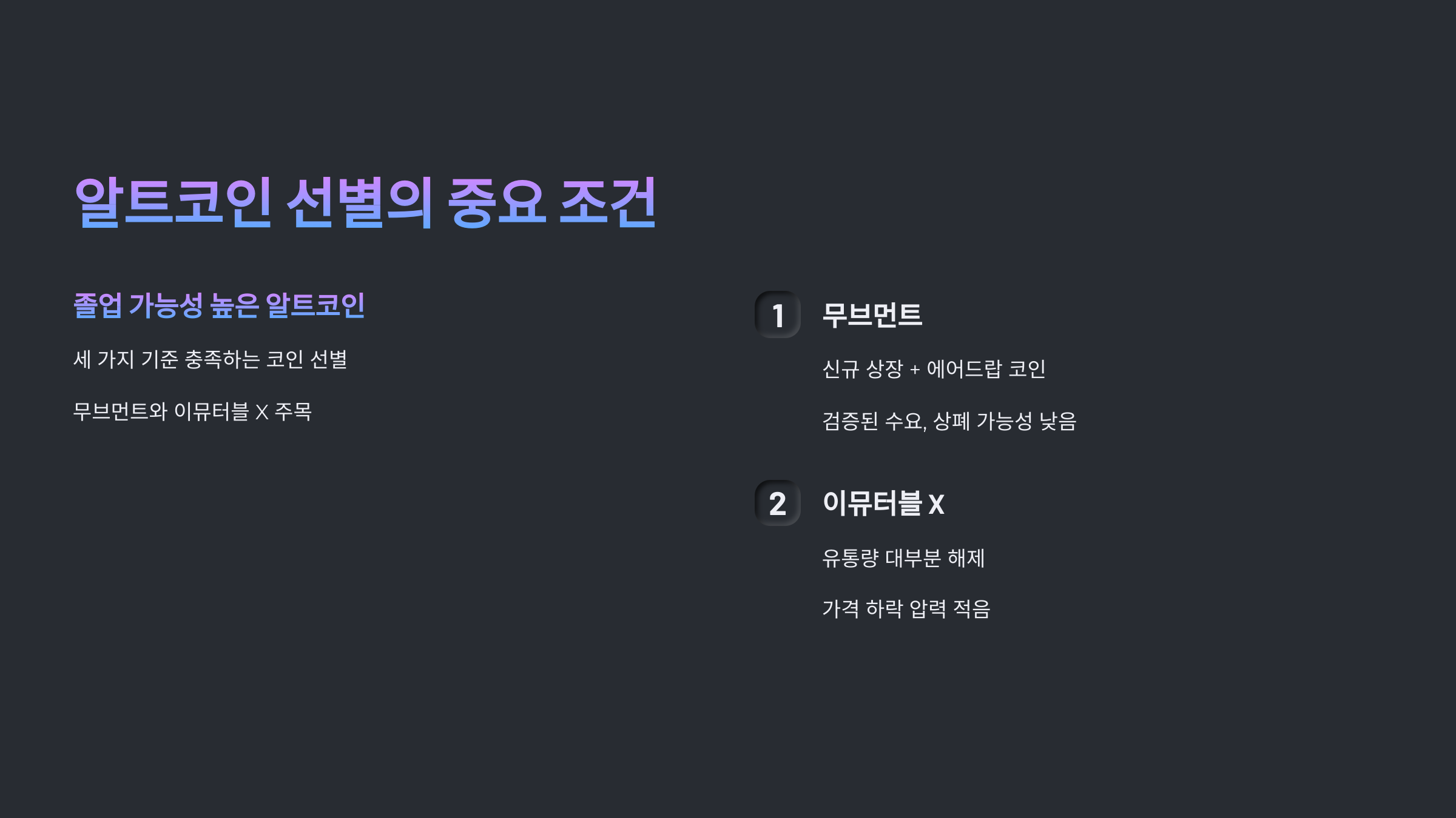 무작위 투자보다는 명확한 기준을 갖고 ‘졸업할 알트’를 고르는 것이 필수입니다.