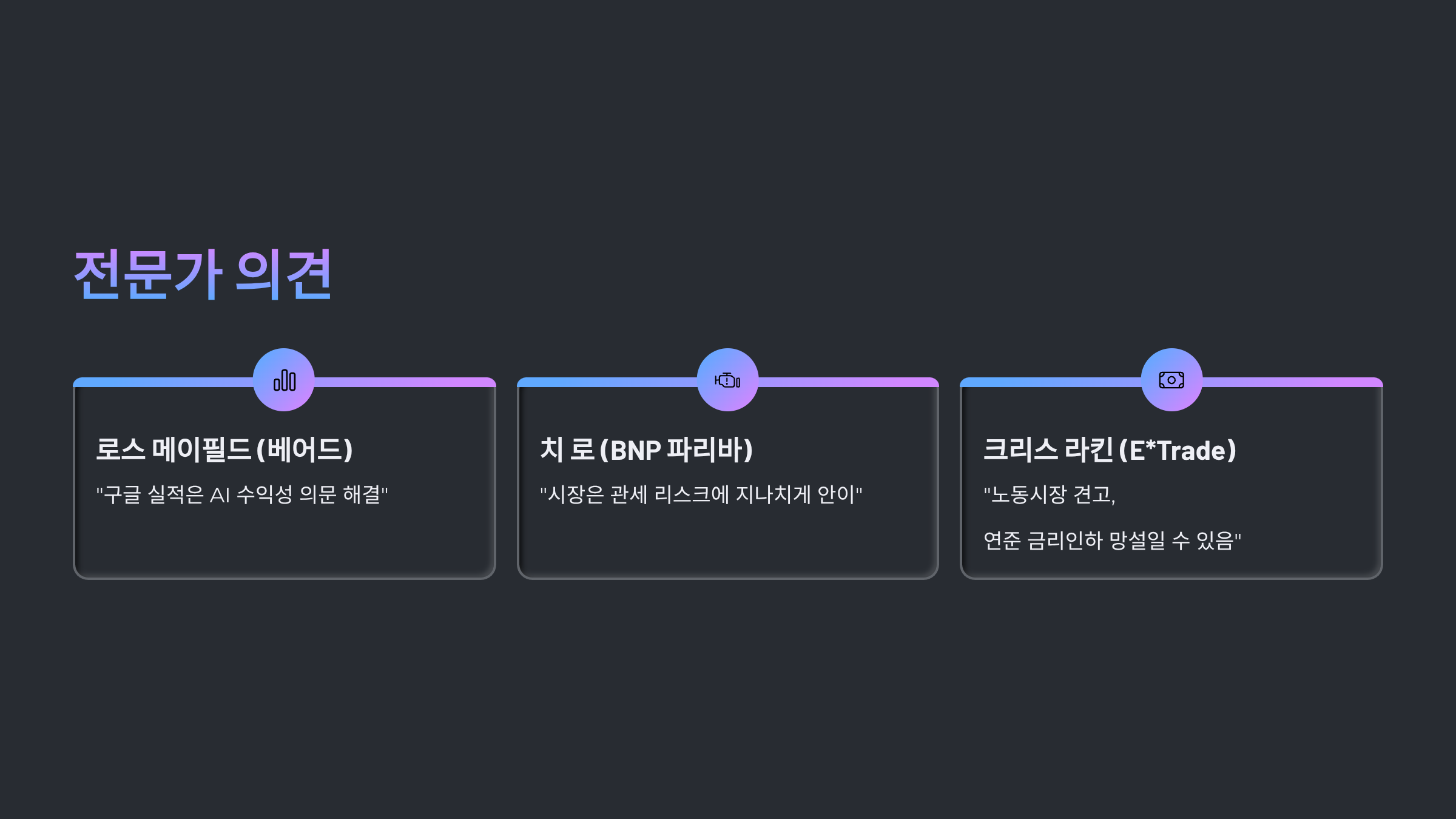| 크리스 라킨 | E*Trade | “노동시장이 견고한 이상, 연준은 금리 인하를 망설일 수 있다.” |