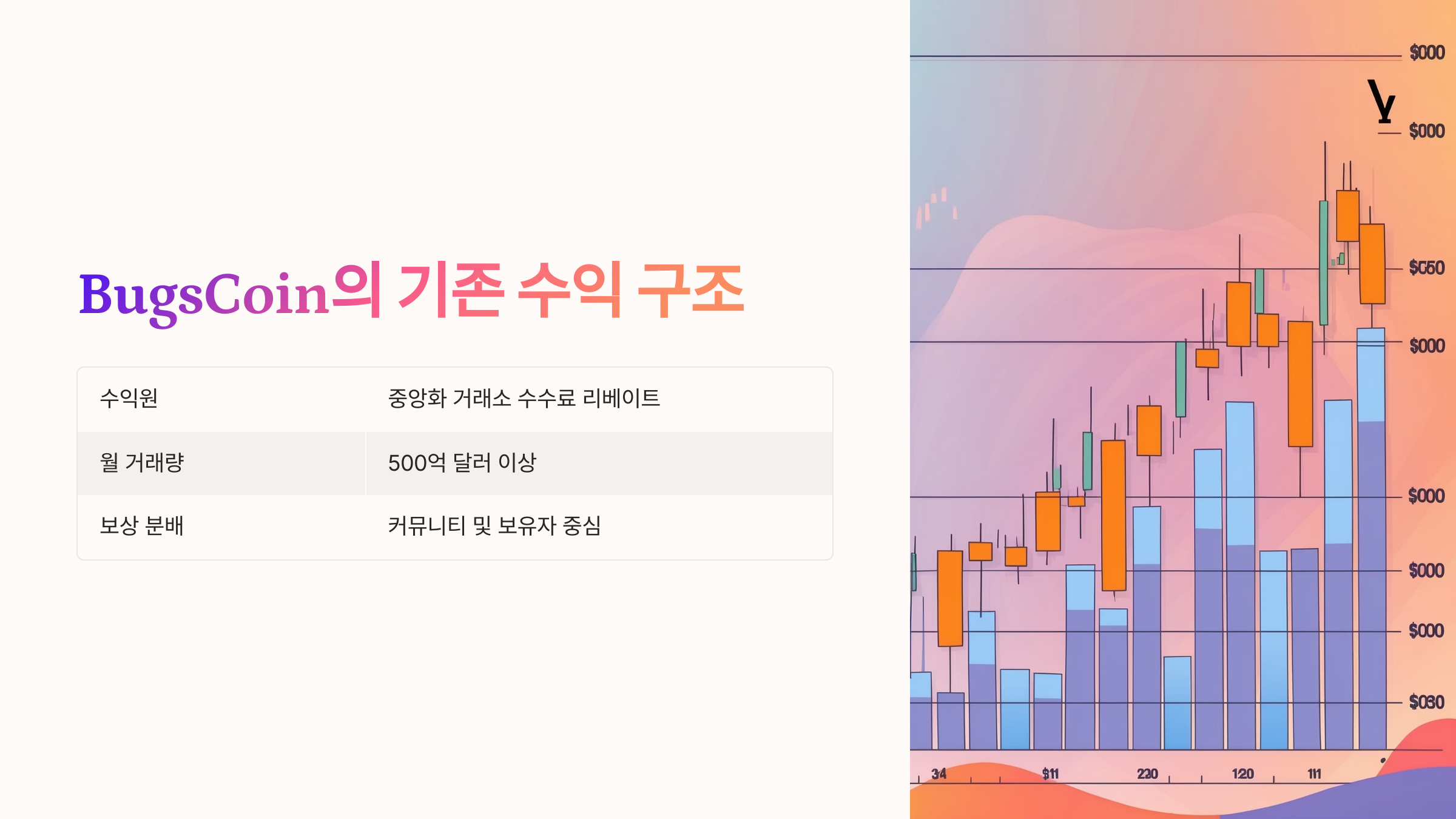 BugsCoin 보유자 및 커뮤니티 참여자들에게도 일정 수준의 수익이 환원되는 모델을 지향합니다.