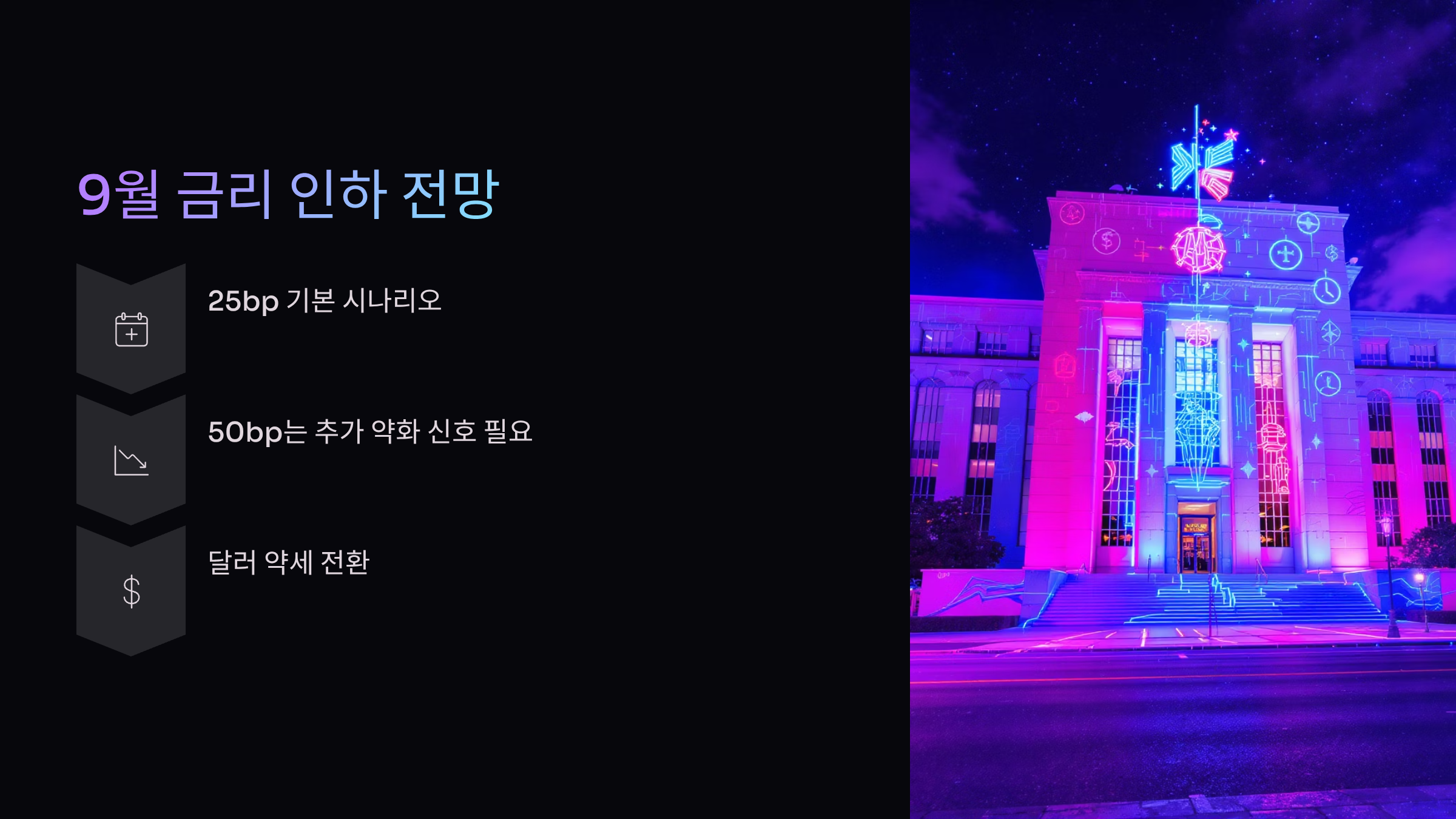 - 9월 인하 폭: 25bp 기본값, 50bp는 추가적 약화 신호(소매판매·PPI) 동반 시 열림.
